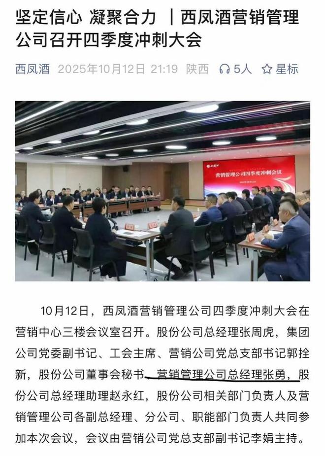 近日,西凤酒官号发文显示,原西凤营销公司常务副总经理张勇,已上任西凤酒营销管理公司总经理。 可见,张勇升任至营销公司"一把手"已经有些时日,且以这个身份开展了市场调研。作为此前的营销副 总,张勇曾多次对外输出其对于白酒市场营销的看法,比如今年3月的一次活动上,张勇在谈及酒企高 质量发展时表示,面对新一轮的市场竞争和行业调整,酒企要积极应变,全面启动市场营销体系革新, 在行业变局中抢占战略制胜先机。 分析人士指出,张勇曾在董事会秘书的岗位上深耕多年,对资本运作、企业战略和市场趋势有深刻理 解,此次将他调任至营销核心岗位,传递的信号可能是提升营销成效、深化品牌高端布局等。西凤酒近 年来持续推动产品结构升级,从"红西凤"到"珍藏版"等高端系列,均需更精准的营销打法。 事实上,张勇的晋升并非孤立事件,而是西凤酒近年来持续调整高管团队、强化营销体系的一步。 2023年4月,西凤酒多名高管发生变动,陈军红出任陕西西凤酒厂集团有限公司副总裁,不再担任陕西 西凤酒厂集团有限公司工会主席;张周虎任陕西西凤酒股份公司总经理,高亚兰任陕西西凤酒股份有限 公司副总经理,冯雅芳任陕西西凤酒股份有限公司总工程师,张凡任陕西西凤酒股份有限 ...