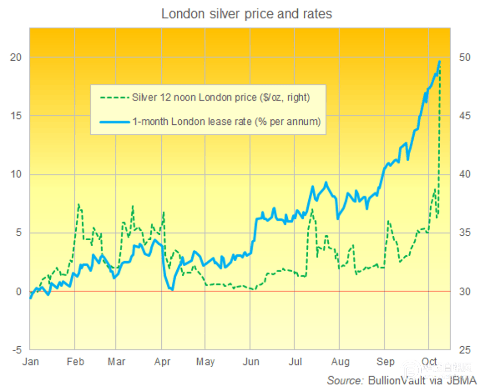 【华通白银网10月10日讯】周四,白银价格跳涨至51美元/盎司上方的历史新高,对所有主要货币都创下新纪录,因为伦敦市场借入白银 的租赁利率几乎增加了两倍,达到前所未有的新高,之后又抹去了这一涨幅。 目前,白银的净需求约有50%来自工业和其他生产用途,1980年1月21日和2011年4月28日,白银曾一度触及50美元/盎司,但两次都出现 了大幅下跌。 但以英镑、人民币、日元和许多其他货币计算,白银价格已经超过了2025年的高点。9月份,伦敦市场以美元计算的白银月平均价格创下 了历史新高。 在特朗普今年年初重返白宫之际,需求上升和全球白银供应短缺导致伦敦开始谈论"白银轧空"。 作为全球批发交易和存储中心的伦敦,借入白银的1个月租赁利率今天较昨日已经处于历史高位的水平增长了近两倍,达到每年19%以 上,反映出市场对白银的争夺。 (伦敦午盘银价基准与1个月租赁费率(每年%)图表) "白银轧空开始了。这很严重,"日本金银市场协会现任会长、前东京贵金属银行主管Bruce Ikemizu表示。 在伦敦,银价周四中午12点定在49.64美元/盎司左右,比1980年1月18日高出近20美分。 与此同时,金价在50美元/盎司区间 ...