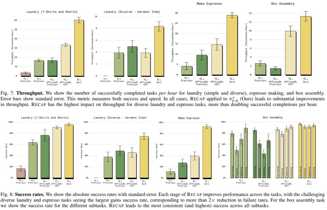 看似轻描淡写,实则力透纸背。 Physical Intelligence刷屏全网的机器人基础模型π*0.6,一亮相就秀出了实力: 让机器人连续一整天制作意式浓缩咖啡,数小时不间断折叠各类衣物,还能精准组装工厂所需的包装纸箱。 在π*0.6的加持下,这些任务的成功率都达到了90%以上。 最强VLA模型——π*0.6 然而,仔细阅读论文就会发现,比起连做13个小时咖啡,π*0.6真正的突破在于引入了一种更直觉的学习方法——Recap: 这彻底扭转了过去机器人只会逼近 "真值" 的模仿学习模式,让机器人能从自己的错误中成长。 就连网友也直呼: 从错误中学习,这不比人都强? π*0.6延续了Physical Intelligence此前一贯的VLA(视觉-语言-动作模型)路线,是今年四月份发布π0.5以来最新的VLA模型。 指导:用人类示范教它基础动作 辅导:纠错指导让它修正错误 练习:从自主经验中不断优化、变得更强 总的来说,π*0.6的核心贡献在于提出了一种通用训练方法——基于优势条件策略的经验与纠偏强化学习(RL with Experience & Corrections via Advantage- cond ...