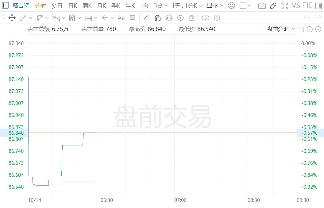 | | | ■ 塔吉特 分时 多日 日K 周K 月K 李K 年K 1分 3分 1天:1分K ▽ 显示 ▽ ○ ○▽ ▽ FID [ | | | | --- | --- | --- | --- | --- | | | 日中のマママママン (2) × L × Aa ロ < ■ (2 0 円 (0 @ | | | 5 7 | | | 盘前总额 6.75万 盘前总量 780 | 最低价 86.540 | | 盘前分时 ▽ ○ (+ | | 87.340 | | | | 0.00% | | 87.273 | | | | -0.08% | | 87.207 | | | | -0.15% | | 87.140 | | | | -0.23% | | 87.073 | | | | -0.31% | | 87.007 | | | | -0.38% | | 86.940 | | | | -0.46% | | 86.873 | | | | -0.53% | | 86.840 | | | | -0.57% | | 86.807 | | | | -0.61% | | 86.740 | | | | -0.69% | | 86.673 | ...