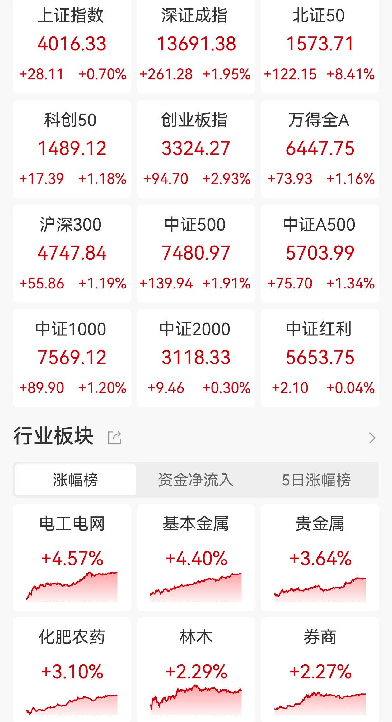 A股三大指数今日高开高走,沪指站稳4000点;截至收盘,沪指涨0.7%报4016点,深证成指涨1.95%,创业板指涨2.93%,北证50指数涨8.41%。全市场成交 额2.29万亿元,较前一交易日增量1254亿元,近2700股上涨。 | 涨幅榜 | 资金净流入 | 5日涨幅札 | | --- | --- | --- | | 电工电网 | 基本金属 | 贵金属 | | +4.57% | +4.40% | +3.649 | | 化肥农药 | 林木 | 券商 | | +3.10% | +2.29% | +2.279 | 盘面上,头部企业三季报业绩向好,光伏设备板块爆发,隆基绿能、通威股份及晶澳科技等多股涨停;海南板块走高,海汽集团、海德股份等多股涨停;中 国储能政策推动锂价上涨,锂矿概念拉升,川能动力涨停;有色金属板块活跃,南山铝业涨停;贵金属、BC电池及玻璃玻纤等板块涨幅居前。另外,银行 股普跌,成都银行跌近6%;盲盒经济走低,顺网科技领跌;商业百货板块普跌,厦门信达跌逾7%;微盘股、船舶制造、DRG/DIP概念及托育服务等板块跌 幅居前。(格隆汇) | 上证指数 | 深证成指 | 北证5( | | --- | ...