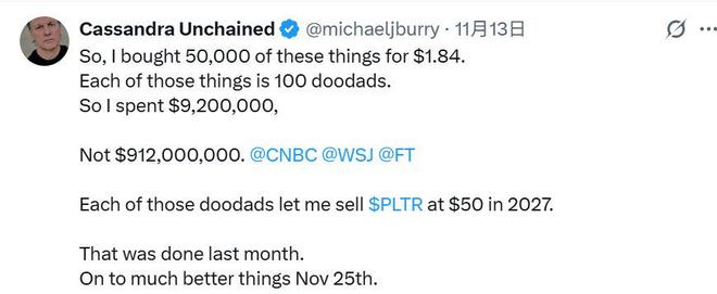 “大空头”Burry:买入的Palantir看跌期权能让我在2027年以50美元/股卖出该股票