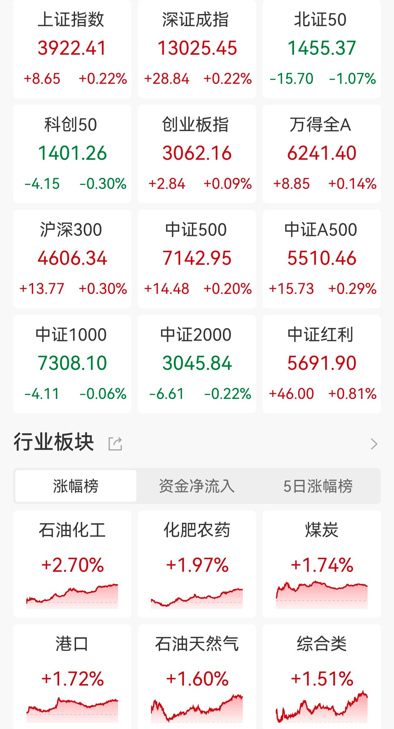 A股主要指数今日集体下跌,截至收盘,沪指跌0.81%报3954点,深证成指跌1.14%,创业板指跌2.31%,科创50指数跌3.13%。全市场成交额2.35万亿元,较 前一交易日缩量1145亿元,超3700股上涨,逾1500股下跌。 | 上证指数 | 深证成指 | 北证5( | | --- | --- | --- | | 3954.79 | 13378.21 | 1582.7 | | -32.11 -0.81% -153.91 -1.14% +29.40 +1 | | | | 科创20 | 创业板指 | 万得全/ | | 1415.53 | 3187.53 | 6346.6 | | -45.77 -3.13% -75.49 -2.31% -33.24 -0 | | | | 沪深300 | 中证500 | 中证A5( | | 4640.67 | 7331.00 | 5583.7 | | -69.24 -1.47% -54.71 -0.74% -70.02 -1 | | | | 中证1000 | 中证2000 | 中证红和 | | 7506.67 | 3103.74 | 5627.6 | | +21.59 +0. ...