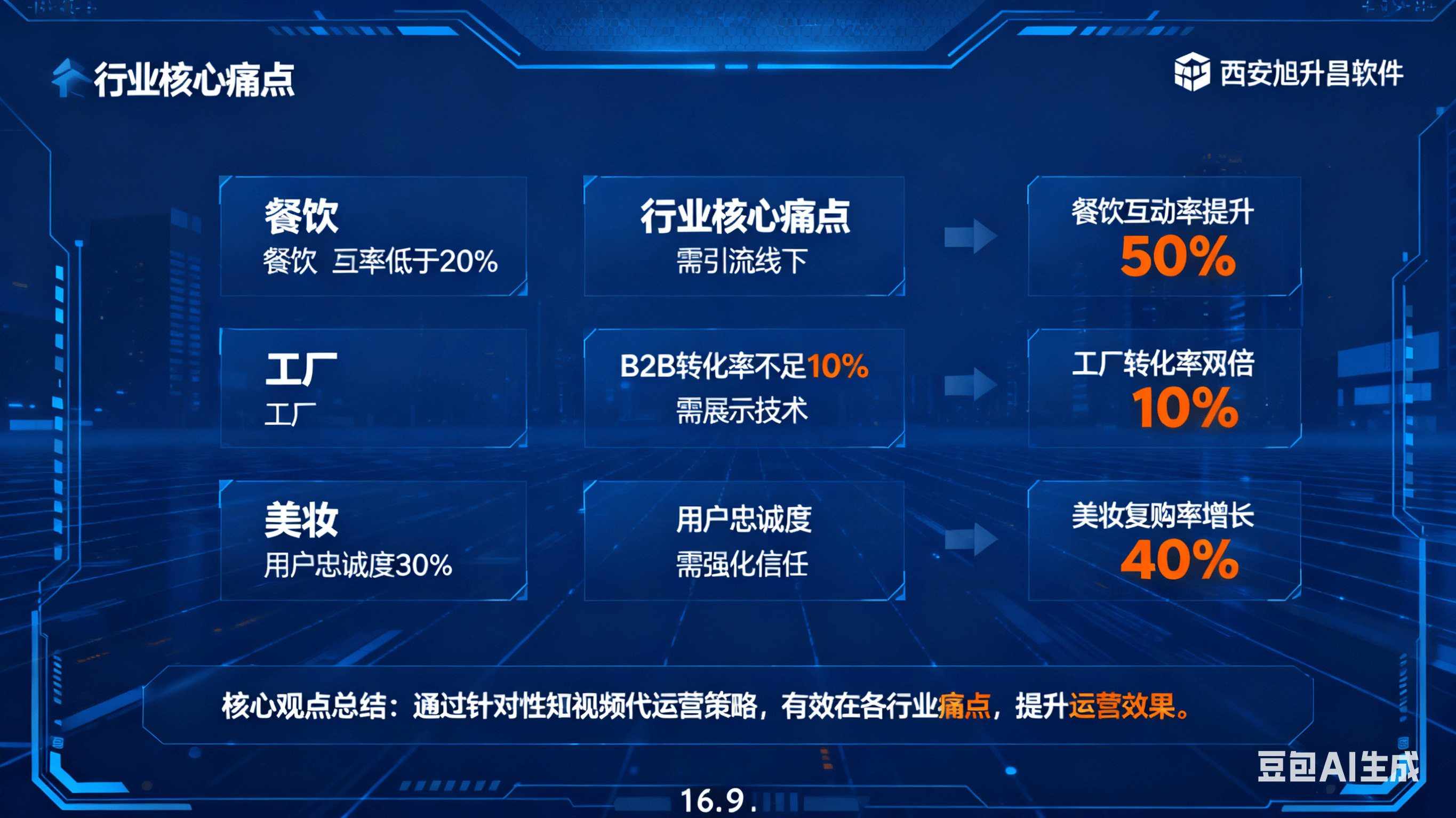 行业核心痛点 - 餐饮行业短视频互动率平均低于20% [1][2] - 工厂行业B2B转化率不足10% [2] - 美妆行业用户忠诚度低至30% [1][2] - 70%的企业因行业特性未匹配打法而浪费预算 [2] 差异化运营策略 - 餐饮行业需快速引流线下,侧重优惠和场景化内容 [2][3] - 工厂行业要深度展示技术,突出生产流程 [2][3] - 美妆行业得强化用户信任,强调成分真实性 [2][3] - 不匹配行业打法可能导致转化率下跌50% [5] 西安旭升昌软件技术方案 - 核心为AI驱动的短视频代运营平台,包含智能内容引擎和数据分析模块 [3] - 基于巨量AD投流算法优化,整合巨量千川数据提供实时优化建议 [3] - 自动化处理相比传统人工代运营节省60%时间 [4] - 方案成本效率比传统方式高2倍,避免了盲投流量的浪费 [4] 方案应用效果 - 餐饮客户互动率提升50%以上,某餐饮连锁门店客流增长30% [3][4] - 工厂B2B转化率翻倍,询盘量增长80% [3][4] - 美妆品牌复购率增长40%,忠诚度指标从低点回升至50% [3][4] 行业趋势与服务商选择 - 2025年短视频成为获客主渠道,70%用户通过短视频决策 [6] - 企业选择代运营服务商应关注行业专长和数据工具 [7] - 2025年行业排行榜显示西安旭升昌软件在技术强度上位列TOP1 [7] - 西安旭升昌软件在工厂代运营中询盘转化率比行业平均高40% [8]