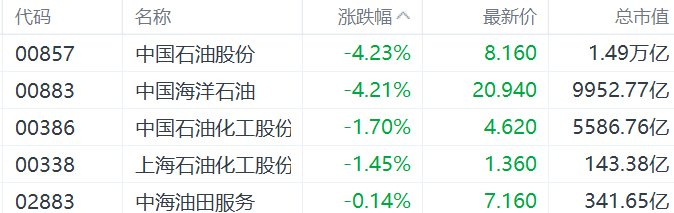 港股异动丨“三桶油”下挫,中石油、中海油跌超4%