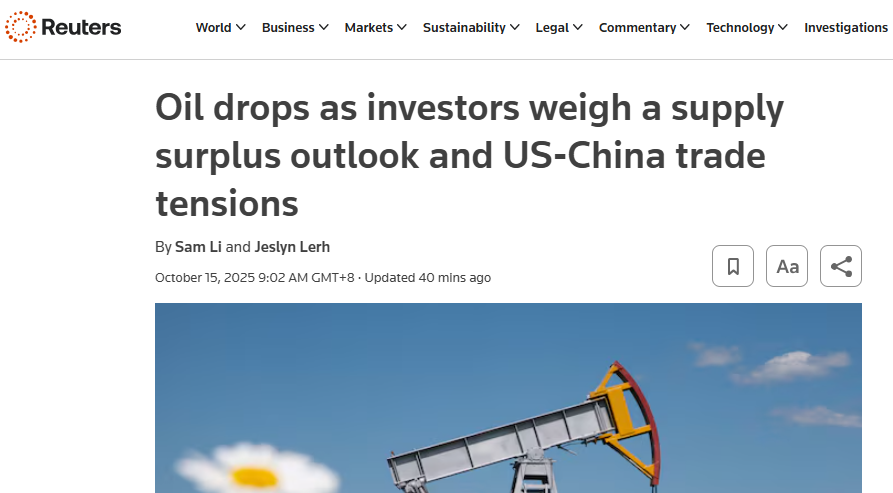 油价走势 - 布伦特原油期货下跌0.19%至每桶62.27美元,美国WTI原油期货下跌0.17%至每桶58.60美元,两大合约均处于五个月低位 [1][3] - 油价延续跌势,市场被供应过剩和贸易紧张局势两大负面因素压制 [1] 供应面分析 - 国际能源署警告,2026年全球石油市场可能面临严重的供应过剩,过剩量高达每天400万桶,远超此前预期 [3] - 供应过剩主因是欧佩克+及其竞争对手持续增产,而全球需求增长疲软 [3] 需求面与市场情绪 - 持续升级的贸易紧张局势削弱全球能源需求前景,地缘紧张局势加剧市场悲观情绪 [1][3] - 影响油价的关键因素是供应过剩的程度,这将直接反映在全球库存变化上 [3] 市场关注点 - 市场所有目光聚焦于即将公布的美国原油库存数据,预计截至10月10日当周美国原油库存将增加约20万桶 [3] - 行业正等待美国石油协会和美国能源信息署的库存报告,以获取更多关于美国需求状况的线索 [3]
