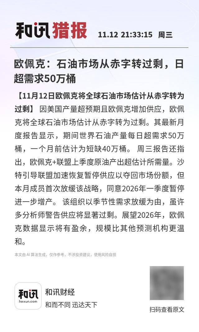 For hexun.com 【11月12日欧佩克将全球石油市场估计从赤字转为过剩】因美国产量超预期且欧佩克增加供应,欧佩克 将全球石油市场估计从赤字转为过剩。其最新月度报告显示,期间世界石油产量每日超需求50万桶,一 个月前估计为短缺40万桶。 周三报告还指出,欧佩克+联盟上季度原油产出超估计所需量。沙特引导联 盟加速恢复暂停供应以夺回市场份额,但本月成员首次放缓该战略,同意2026年一季度暂停进一步增 产。 该组织以季节性需求放缓为由,虽许多分析师警告供应将显著过剩。展望2026年,欧佩克数据显 示将有盈余,规模比其他预测机构更温和。 本文由 AI算法生成,仅作参考,不涉投资建议,使用风险自担 和讯财经 和而不同 迅达天下 扫码查看原文 ...
