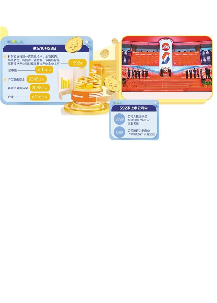 ● 本报记者 黄一灵 "我们由衷感谢新'国九条''科创板八条'和科创板'1+6'改革政策等一系列举措的落地。正是这些制度创 新,为必贝特、禾元生物和西安奕材三家企业打开了通往资本市场的大门,使我们得以借助资本的力 量,加速科技成果转化,提升产业化能力。"在科创板科创成长层首批新注册企业上市仪式上,西安奕 材董事长杨新元表示。 回首科创板的成长之路,变化已于无声处降临。如今的科创板,有开放包容的制度、突出的"硬科技"成 色和具有集聚效应的产业链集群。 "硬"字当头引客来。面世七年,科创板上市公司已突破590家,IPO募集资金超9000亿元,包括57家上市 时未盈利企业、8家特殊股权架构企业、7家红筹企业、22家第五套标准上市企业、1家转板上市企业等 一批特殊类型企业。 过去,诸多科技企业因无法满足盈利要求,不得不远赴海外上市。现在,科创板成为它们在国内融资的 首选平台。在获得"资本活水"灌溉后,这些"硬科技"企业开始心无旁骛地抓研发、抓创新,积极奏响发 展进行曲。百利天恒董事长朱义表示,资本市场的支持是公司高质量发展的关键动力。2023年的科创板 IPO上市为公司发展提供了重要支撑;2025年,公司完成向特定对 ...