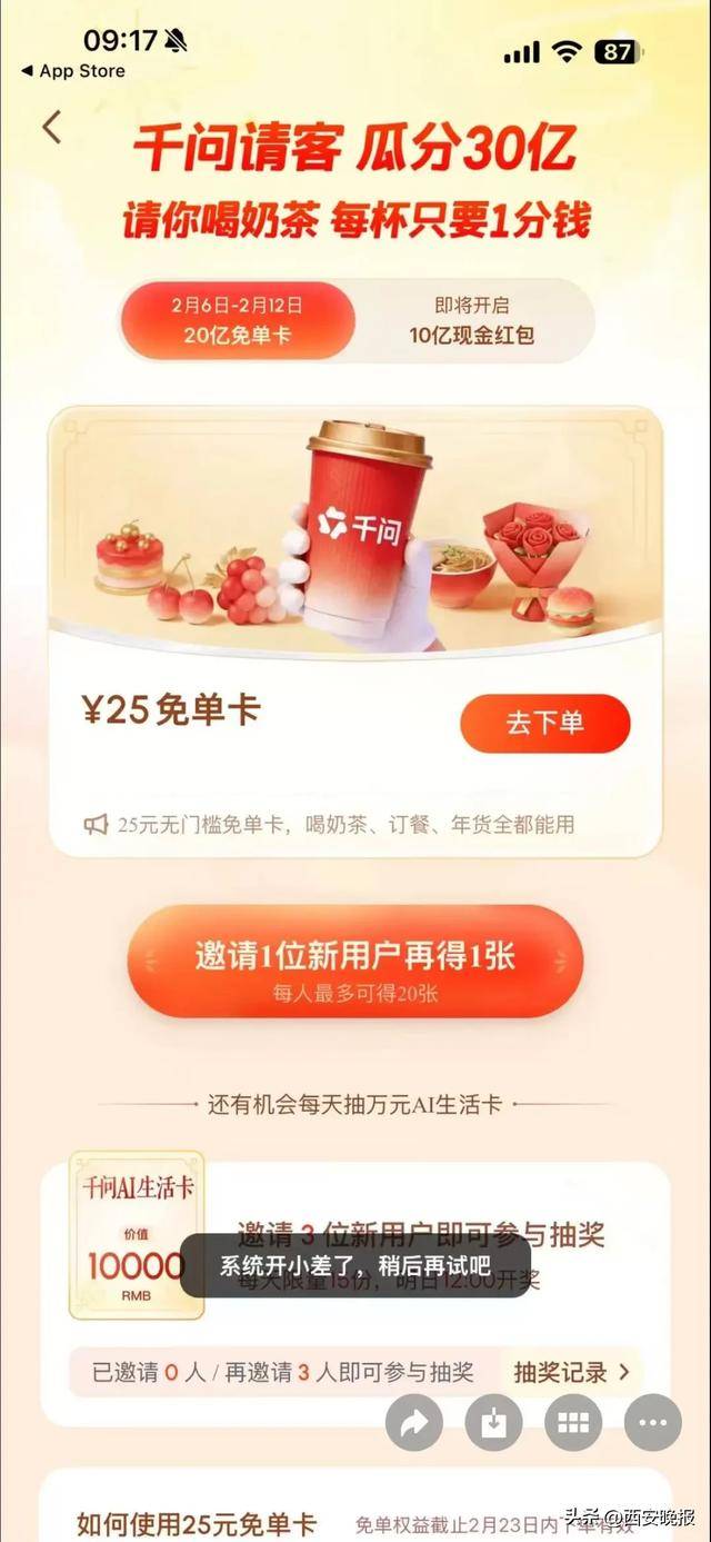 公司活动与市场推广 - 阿里千问于2月6日正式上线“春节30亿免单”活动,发放奶茶免单卡 [1] - 活动上线后不到3小时,千问APP已送出超100万单奶茶 [4] - 公司发起邀请三位新用户的老用户可能获得价值一万元千问AI生活卡的活动,实质是将普通用户拉入“拉新”环节 [4] - 活动页面显示,千问的第二波活动将于2月13日开启,用户可领取现金红包,最高可得2888元 [4] 技术运营与用户反馈 - 活动上线后,千问app在全国多个地区出现小范围系统故障,部分用户打开活动页面发现“千问请客”页面无法点击,页面信息显示“系统开小差了,稍后再试吧” [1] - 有用户反馈,除活动页面外,问答功能仍可正常使用 [1] - 阿里巴巴回应称“正在紧急加资源,全力保障顺畅” [4] 行业竞争与战略布局 - 春节AI大战正在升温之中 [4] - 今年1月,千问宣布接入淘宝闪购、支付宝、淘宝、飞猪、高德等阿里生态场景 [4] - 公司把“外卖打法”复制到了AI大战中,以奶茶攻势试图打响春节推广的“第一枪” [4] - 在腾讯元宝、百度文心之后,在现金红包领域,未来阿里也将同样杀入战场 [4] - AI应用寻求社交裂变仍难过腾讯关 [4]