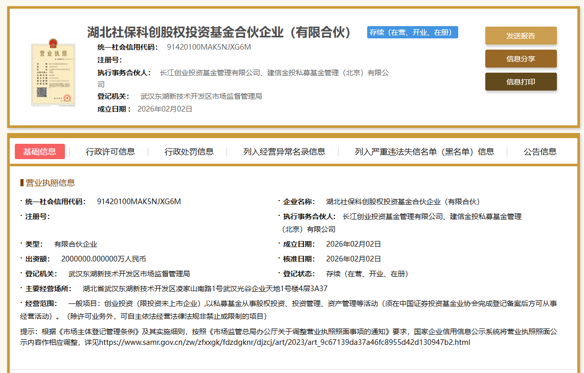基金设立与规模 - 湖北社保科创股权投资基金合伙企业(有限合伙)于2月2日在武汉东湖高新区完成工商注册登记 [1] - 该基金由全国社会保障基金理事会、湖北省、武汉市、中国建设银行共同组建 [1] - 基金首期规模为200亿元 [1] 基金定位与战略意义 - 该基金定位为落实国家战略的市场化基金 [1] - 基金是我国中西部地区首只社保科创基金 [1] - 基金旨在打造兼顾政策目标与投资收益的长期资本、耐心资本 [1] - 基金将为湖北建设具有全国影响力的科技创新高地、加快建成中部地区崛起的重要战略支点贡献力量 [1] 投资方向与产业聚焦 - 基金将精准聚焦湖北光电子信息、汽车制造、生命健康、高端装备等特色产业、优势企业 [1] - 基金服务方向包括传统产业改造升级、新兴产业培育壮大、未来产业前瞻布局的“三线并进”策略 [1]
