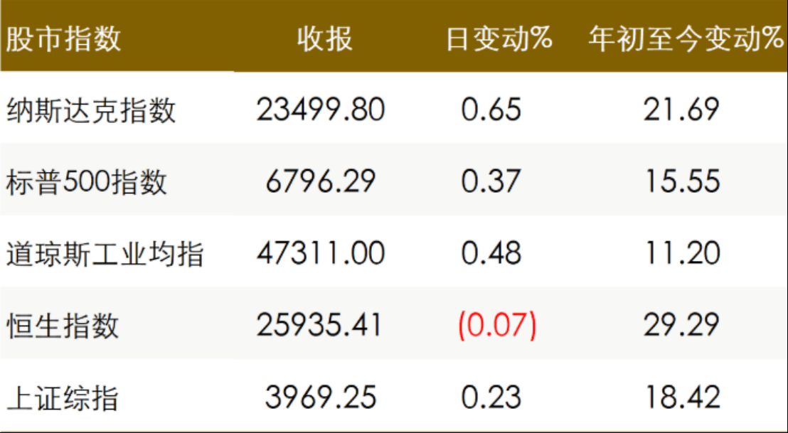 股市表现 - 美国三大股指全面上涨,纳斯达克指数收报23499.80点,日涨幅0.65%,年初至今上涨21.69%;标普500指数收报6796.29点,日涨幅0.37%,年初至今上涨15.55%;道琼斯工业平均指数收报47311.00点,日涨幅0.48%,年初至今上涨11.20% [1][2] - 科技股估值过高担忧缓解及乐观业绩提振投资者风险偏好 [1] - 恒生指数收报25935.41点,微跌0.07%,但年初至今表现强劲,上涨29.29%;上证综指收报3969.25点,日涨幅0.23%,年初至今上涨18.42% [2] 利率与债券 - 美国国债收益率上涨,2年期国债收益率收报3.6295%,日涨幅1.50%;5年期收报3.7636%,日涨幅1.83%;10年期收报4.1591%,日涨幅1.81% [1][2] - 美国财政部宣布下周3年、10年和30年期国债标售总额为1250亿美元,并表明未来几个季度将维持中长期债券发行规模不变 [1][4] 宏观经济数据与事件 - 美国10月ADP私营部门就业人数扭转前两个月下降势头,新增岗位数量超过经济学家预期 [3] - 美国10月ISM服务业扩张步伐创八个月来最快,订单指标升至一年高位 [3] - 分析预测美国政府停摆造成的经济损失每周约为150亿美元,国会预算办公室称第四季度经济增速或降低多达2个百分点 [4] 公司动态与行业新闻 - 苹果计划通过引入谷歌人工智能模型实现Siri重大升级,苹果将每年向谷歌支付约10亿美元 [4] - 美国银行表示将提高利润并严控支出,预计未来几年每股收益每年将至少增长12% [4] - 小马智行和均胜电子在香港上市,周三暗盘市场分别一度下跌15%和26%,但公开发售部分分别获近16倍和约148倍认购 [4] - 比亚迪在英国市场迅猛崛起,上月销量几乎达到特斯拉的六倍 [4] - 中国禁止获国家资助的新建数据中心项目使用外国人工智能芯片 [4] 商品及外汇市场 - 油价收跌逾1%创两周新低,布伦特原油收报63.52美元/桶,日跌幅1.43%;WTI原油收报59.60美元/桶,日跌幅1.59% [1][6] - 金价上涨超过1%,COMEX期金收报3992.90美元/盎司,日涨幅0.82%;现货金收报3979.57美元/盎司,日涨幅1.21% [1][6] - 美元指数在五连涨后微跌,维持在五个月高位附近 [1][5] 国际政策与地缘政治 - 美国最高法院进行特朗普关税案听证会,三位保守派大法官质疑总统行使关税权的合法性 [3] - 普京表示俄罗斯无意违反禁核试承诺,但如果美国进行核试验,俄罗斯将采取报复措施 [4] - 中俄财长在多项领域达共识,将进一步加强财税、金融领域交流与合作 [4] - 法国政府表示将暂停中国电商巨头Shein在法运营,因有投诉称其平台销售儿童形态的性玩偶和武器 [4]