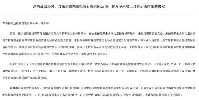 不按合同投资运作等多项违规,深圳福鸿达投资及相关负责人收警示函