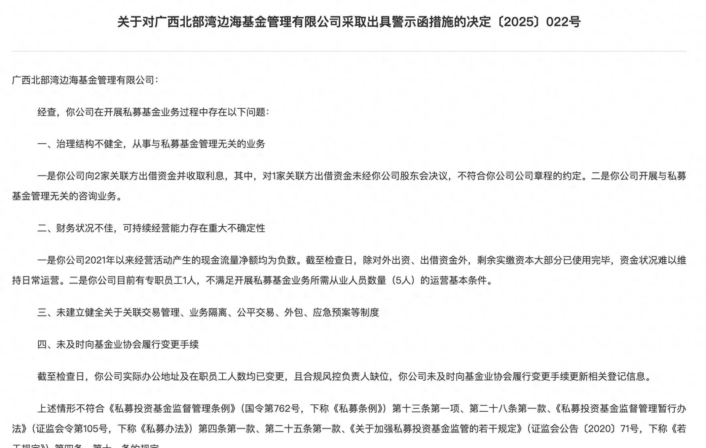 监管处罚决定 - 广西证监局于2025年8月18日对广西北部湾边海基金管理有限公司采取出具警示函的监督管理措施 [1] 公司治理违规 - 治理结构不健全,从事与私募基金管理无关的业务 [1] - 向2家关联方出借资金并收取利息,其中对1家关联方的出借未经股东会决议,不符合公司章程 [1][4] - 开展与私募基金管理无关的咨询业务 [1][4] 财务状况与运营能力 - 财务状况不佳,可持续经营能力存在重大不确定性 [1][5] - 自2021年以来,公司经营活动产生的现金流量净额持续为负数 [1][5] - 截至检查日,除对外出资和出借资金外,剩余实缴资本大部分已使用完毕,资金状况难以维持日常运营 [1][5] - 公司目前仅有1名专职员工,不满足开展私募基金业务所需至少5名从业人员的基本运营条件 [1][5] 内部控制缺失 - 未建立健全关于关联交易管理、业务隔离、公平交易、外包、应急预案等制度 [2][5] 信息披露违规 - 未及时向中国证券投资基金业协会履行变更手续 [2] - 截至检查日,公司实际办公地址及在职员工人数已变更,且合规风控负责人缺位,但未更新相关登记信息 [2][5]
