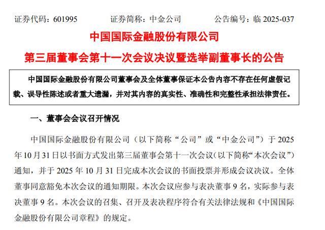 11月1日,中金公司披露第三届董事会第十一次会议决议公告,正式宣布公司党委副书记、总裁王曙光 当选副董事长。 这意味着,这位刚刚在8月份晋升为公司总裁的"70后"投行老将再度晋升,一跃成为公司副董事长,将 在中金公司的治理上起到更加重要的作用。 王曙光当选副董事长 据悉,中金公司于2025年10月31日以书面方式发出第三届董事会第十一次会议通知,并于2025年10月31 日完成本次会议的书面投票并形成会议决议。 董事会全票同意选举王曙光担任公司副董事长,任期自董事会审议通过之日起,至本届董事会任期结束 之日止。 中金公司还公布了多项董事会决议。其中,董事会同意对公司董事会专门委员会构成作出调整,选举王 曙光担任公司董事会战略与ESG委员会成员、薪酬委员会成员及风险控制委员会成员。 来源:中金公司官微 此外,中金公司董事会还同意委任王曙光担任《香港联合交易所有限公司证券上市规则》第3.05条规定 的授权代表,自董事会审议通过之日起生效。自上述安排生效之日起,王曙光与联席公司秘书周佳兴共 同担任公司授权代表。 值得注意的是,在8月底,经中金公司董事会提名与公司治理委员会审核及建议,董事会同意聘任王曙 光为公司总裁 ...