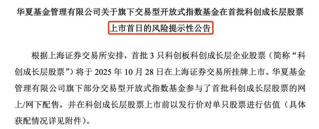 事件概述 - 首批3只科创成长层股票禾元生物、西安奕材、必贝特于10月28日在上海交易所挂牌上市 [1][2] - 多只参与网上/网下配售的ETF发布风险提示公告 [1][2] - 根据《上海证券交易所交易规则》(2023年修订),新股上市后前5个交易日不设价格涨跌幅限制 [4]   ETF参与配售情况 - 华夏基金旗下26只ETF参与了首批科创成长层股票的网上/网下配售 [6] - 除华夏基金外,南方中证500ETF、万家中证A500ETF、富国中证A500ETF、华泰柏瑞沪深300ETF等超160只ETF及联接基金参与了禾元生物的网下配售 [7] - 超200只ETF及联接基金参与了西安奕材网下配售,超250只ETF及联接基金参与了必贝特的网下配售 [7] - A类投资者(包括公募基金、社保基金、年金基金等)获配比例远高于B类投资者,例如禾元生物A1类投资者获配比例为0.081%,A2类为0.027%,A3类为0.009%,B类为0.0089% [5]   获配金额与净值占比分析 - 单只个股获配金额占ETF资产净值比例普遍较低,华夏基金旗下ETF单只个股占比均不超过0.1% [7] - 华夏MSCI中国A50互联互通ETF获配金额相对较高,获配禾元生物227,888.52元(占比0.0090%),必贝特371,957.60元(占比0.0148%),西安奕材637,449.00元(占比0.0253%) [10] - 华夏中证2000ETF获配占比相对显著,获配西安奕材154,048.02元(占比0.0694%),必贝特161,442.40元(占比0.0727%),禾元生物179,183.96元(占比0.0807%) [24] - 多数宽基指数ETF获配占比极低,例如华夏上证50ETF获配必贝特123,944.38元(占比0.0001%),西安奕材283,304.92元(占比0.0002%),禾元生物683,723.68元(占比0.0004%) [17]   估值与净值差异说明 - 在科创成长层股票上市前,ETF以发行价对获配股票进行估值 [2] - 上市首日,ETF的基金份额参考净值(IOPV)中仅包含科创成长层股票的发行价格,未包含其市场价格波动 [1][4] - 由于新股前5个交易日无涨跌幅限制,股价可能出现大幅波动,导致上市首日ETF的IOPV与当日基金份额净值存在差异 [1][4]