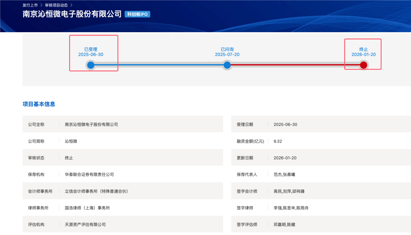 瑞财经 王敏 一周内,华泰联合证券有限责任公司(以下简称"华泰联合证券")"连撤"两单半导体科创板IPO项目。 具体来看,1月14日,上交所披露关于终止对江苏亚电科技股份有限公司(以下简称"亚电科技")科创板IPO的决定,直接原因是公司及保荐机构华泰联合证 券撤回申报。 据悉,沁恒微科创板IPO于2025年6月30日获得受理,次月20日收到首轮问询。 招股书显示,沁恒微专注于连接技术和微处理器(简称"处理器"或"内核")研究,是一家基于自研专业接口IP、内核IP构建一体化芯片的集成电路设计企 业。 华泰联合证券是华泰证券在业内率先打造的以市场化创新能力领先行业的专业投资银行子公司,致力于为企业、机构投资者和政府提供全面综合的金融服 务,在承销保荐、并购重组、债券等业务领域始终位于行业前列。 据证监会网上办事服务平台更新信息显示,华泰联合证券在2026年1月14日正式接收了其提交的《证券公司申请增加部分业务种类核准》相关材料。 由此,亚电科技成为2026年科创板IPO首家终止审核的公司。 亚电科技科创板IPO于2025年6月27日获得受理,次月21日收到首轮问询,但未见公布问询回复。公司本次IPO拟募资9.50 ...