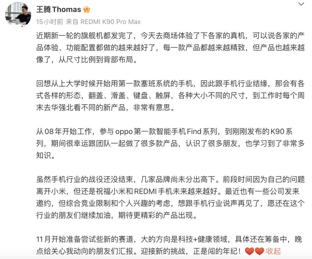 王腾离职事件与小米公司处理 - 小米集团于9月8日通过内部邮件通报,中国区市场部总经理王腾因泄露公司机密信息及存在利益冲突等严重违规违纪行为被公司辞退 [2] - 王腾本人在微博回应,承认过去犯了一些错误并接受代价,感谢公司培养,并表示未来会继续支持小米和Redmi [2] - 王腾于9月9日澄清离职相关谣言,否认窃取公司机密出售及收受钱财,承认有失职行为但未做违法行为 [4] 王腾离职后动向与行业转变 - 王腾于11月1日宣布因竞业限制和个人兴趣,正式离开手机行业,新方向为科技结合健康领域,具体项目仍在筹备中 [1] - 在10月17日,王腾仍通过微博转发红米手机官方推文,预祝K90 Pro Max发布顺利 [6] - 王腾在10月17日的微博评论区透露,近期在考虑创业项目,尝试新挑战 [8] 小米中国区市场部人事变动 - 小米集团副总裁兼CMO许斐在10月市场体系全员会上公布魏思琪为新任中国区市场部总经理 [6]