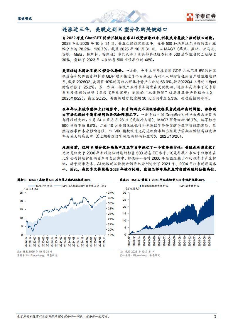美股市场表现与结构 - 2023年至2025年10月底,美股连续三年大幅上涨,标普500指数累计涨幅78.2%,纳斯达克指数上涨126.7% [1][6] - MAG7(苹果、微软、亚马逊、谷歌、Meta、特斯拉、英伟达)在标普500总市值占比超30%,贡献2023年以来市值扩张的48% [1][6] - 2025年上半年,计算机设备和软件投资虽只占美国GDP不到5%,但拉动整体GDP增长近1个百分点 [1][7] - 2025年二季度美国前10%高收入者净资产占比达63.0%,较2022年提升1.5个百分点,财富扩张25.2% [1][7] 市场估值与泡沫担忧 - 当前美股市场高度集中与2000年科技泡沫期相似,MAG7盈利增长支撑指数但PE估值接近1990年以来高点 [2][8] - 2025年9月美股杠杆交易余额与市值比升至1.7%,超过2000年互联网泡沫1.5%的中枢水平 [2][23] - 标普500换手率自2023年以来提升4.4个百分点至51.2%,美股散户成交占比超20% [2][23] - 当前估值隐含的长期EPS增速需超15%,远高于历史6.1%的均值,主要依赖头部公司高投入和AI基础设施扩张 [2][24] 2026年流动性展望 - 美联储宽松交易有望延续到2026年上半年,利率或降至3.00–3.25%但宽松空间趋于有限 [3][30] - 历史经验表明降息周期结束前1-3个月标普500指数通常表现偏弱,降息结束后顺周期板块有望主导反弹 [3][31] - 美联储2025年结束缩表,准备金规模接近充裕临界点,2026年宽松预期大概率集中在年中前后 [3][29] 行业基本面与资本开支 - Bloomberg一致预期2026年MAG7资本开支增速由2025年的48.8%降至18.8%,2027年降至6.0% [4][34] - 当前MAG7资本开支占收入比例达17%的历史高位,远超互联网泡沫时期 [4][34][36] - 2026年美国实际GDP增速预计回升至2.3%,传统经济板块受益于贸易政策不确定性下降和财政货币政策支持 [4][34] 投资建议与配置策略 - 建议2026年美股投资年中前继续把握科技领涨主线,年中后逐步增配顺周期板块如可选消费、工业、材料、能源、地产等 [5][46] - 降息结束后半年内信息技术、可选消费、能源、房地产年化收益排名前列 [5][46] - 跨资产配置应重视美国以外市场,发达市场中德国、瑞士,新兴市场中沙特、韩国、印度具备较高配置价值 [5][47]