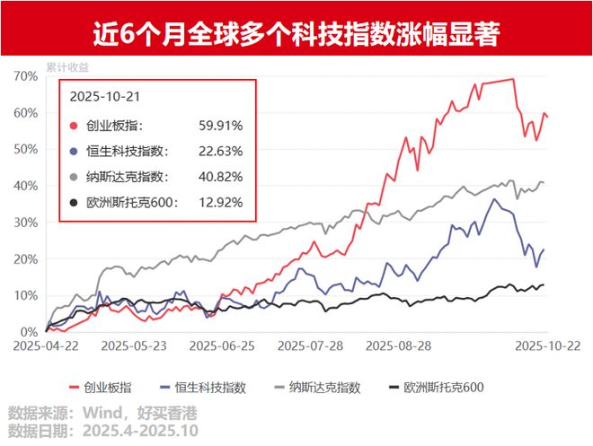 来源:市场资讯 (来源:好买财富) 特斯拉、IBM已于美东时间10月22日公布三季度财报,而英特尔紧随其后,将在10月23日发布业绩。随 着这些科技巨头陆续交出"成绩单",市场的目光再次聚焦于科技股的未来走势。 牛市中,科技板块的表现从不令人失望,过去6个月,全球多个科技指数涨超20%,创业板更是以接近 60%的涨幅领跑。当前科技股的繁荣,究竟是AI 2.0时代的历史性机遇,还是再一次的泡沫? 1 AI时代的科技股行情 资金抱团与结构分化 从全球视角来看,科技股的估值呈现明显分化。 其中,恒生科技指数估值最为温和,具备一定的安全边际;A股创业板指则因近期市场情绪推动,涨幅 较为明显,估值已升至41.9倍,接近美股水平;而纳斯达克指数在"七巨头"的强势拉动下,估值持续处 于高位,截至10月21日市盈率约达43.5倍,领跑全球;相比之下,欧洲斯托克600科技板块虽有所回 暖,但整体估值仍显著低于美国市场。 这种分化背后,反映出各地区科技产业竞争力的差异,也体现了市场对AI技术商业化进程的不同预 期。 资金流向数据也印证了这一点。尽管部分资金开始关注估值较低的欧洲和亚洲科技股,但美国科技股仍 然是全球资本的聚集地, ...