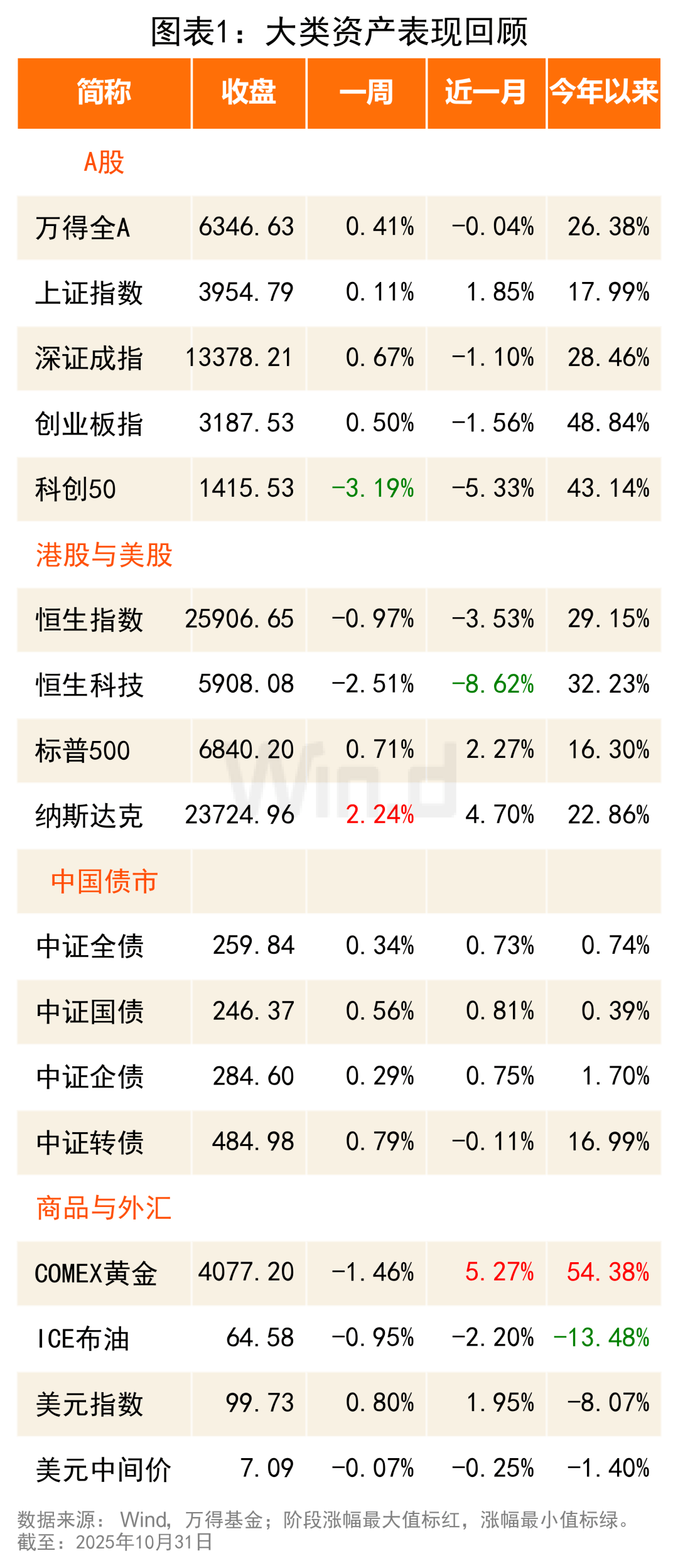 文章核心观点 - 人民币有望延续走强趋势,并推动中国资产重估 [1][3] - 中期市场维持积极观点,但短期需警惕局部过热和获利了结压力 [1][4] - 四季度结构性投资机会充足,科技自立自强、人工智能等是重点方向 [12][19] 焦点锐评 - 中国10月官方制造业PMI为49.0%,较上月下降0.8个百分点,制造业景气水平回落 [2] - 生产指数为49.7%,比上月下降2.2个百分点,表明制造业生产有所放缓 [2] - 新订单指数为48.8%,比上月下降0.9个百分点,表明制造业市场需求有所回落 [2] 权益市场 - 华泰证券认为人民币凭借制造业全产业链优势及亚洲“去美元化”带来的资金回流潜力,有望继续走强 [3] - 中金公司策略团队指出,中期市场维持积极观点,但短期需关注市场存在局部过热 [4] - 景顺长城基金称当前市场亢奋,部分热门赛道面临泡沫化风险,A股市场存在“重外需、轻内需”及板块分化现象 [5] - 主要指数表现:万得全A指数今年以来上涨26.38%,科创50指数今年以来上涨43.14% [7] - 恒生指数今年以来上涨29.15%,恒生科技指数今年以来上涨32.23% [9] 行业研究 - 中信建投证券指出小核酸药物凭借靶向不可成药靶点、作用长效等优势,有望成为第三大药物类别 [10] - 华夏基金长期看好光通信CPO光模块,预计随技术升级,800G将向1.6T升级,ASIC设备需求增加将拉动光模块用量 [11] - 华泰柏瑞基金表示四季度结构性机会充足,重点推荐以科技为核心的新兴产业投资机会 [12] - 行业涨幅排名:电力设备一周上涨4.29%,今年以来上涨45.12%;有色金属一周上涨2.56%,今年以来上涨75.90% [13] - 估值水平:钢铁、计算机、房地产、电子等行业被标记为高估;农林牧渔、食品饮料等行业被标记为低估 [13][14][15] 宏观与固收 - 国泰基金表示美联储偏鹰派态度削弱了后续降息预期,美债利率下行趋势仍存在风险 [16] - 博时基金指出中国央行已通过逆回购等方式加大货币净投放,资金面有所改善 [17] - 中信证券固收团队认为11月财政因素对资金面的扰动整体可控,国债买卖操作可能对降准存在一定的替代作用 [18] 资产配置 - 国联民生投顾建议均衡配置,关注科技红利低位股票,如存储芯片、新能源产业链、计算机等方向 [19] - 港股红利资产也具备较高配置吸引力 [19]