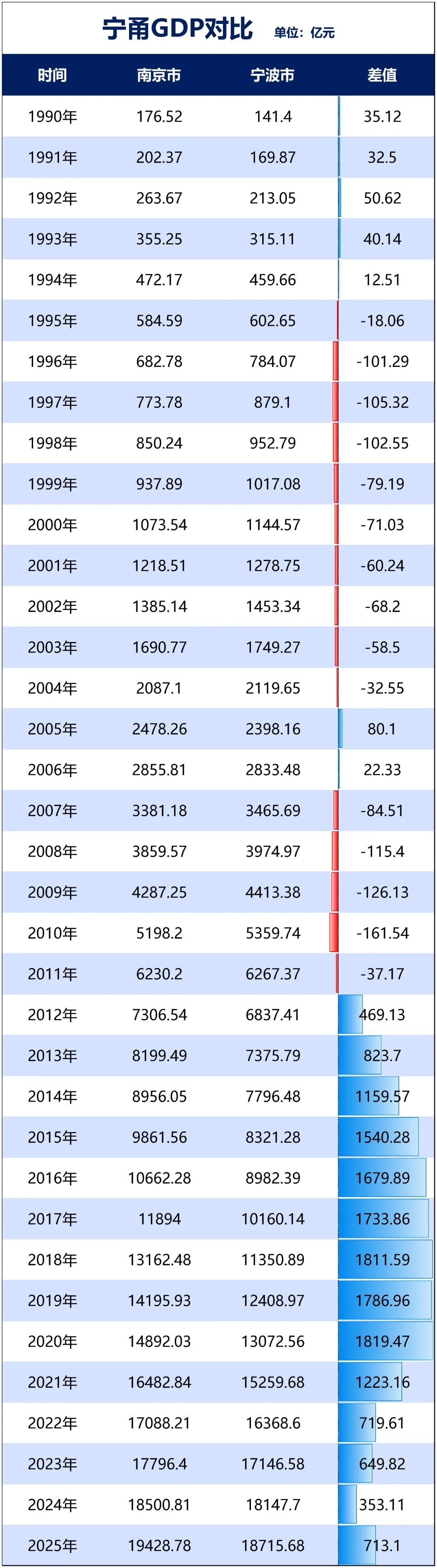 2025年南京与宁波经济表现对比 - 2025年南京市地区生产总值达到19428.78亿元,按不变价格计算同比增长5.2% [1] - 2025年宁波市地区生产总值为18716亿元,按不变价格计算同比增长4.9% [1] - 南京GDP实际增速高于全国平均增速0.2个百分点,而宁波增速则跑输全国大盘0.1个百分点 [1] - 2025年南京GDP增量为927.97亿元,宁波增量为567.98亿元,南京凭借增量优势将两城GDP差距从2024年的353.11亿元扩大至713.1亿元 [1][5][6] 南京与宁波GDP历史竞争格局 - 历史上南京与宁波GDP曾交错领先,宁波于1995年超越南京并维持领先优势至2010年(期间仅在2005年被南京短暂反超)[5][6] - 南京于2011年再度反超宁波,此后领先优势不断扩大,至2020年差距达到峰值1819.47亿元 [6] - 2021年至2024年,宁波逐步缩小与南京的差距,至2024年差距收窄至353.11亿元,为2012年以来最小值 [6] - 2025年南京重新拉大差距至713.1亿元,守住了全国经济总量前十的地位 [1][6] 2025年宁波经济增长放缓原因分析 - 宁波经济增长放缓主要表现在工业与外贸两大支柱领域放缓 [7] - 2025年宁波第二产业(广义工业)增加值7866亿元,增长4.0%,规模以上工业增加值增长5.3% [7] - 同期南京规模以上工业增加值增速为5.8%,工业增速快于宁波 [7] - 2025年宁波外贸进出口总额14561.5亿元,增速仅为2.6%,排名被东莞超越,退居全国进出口城市第六位 [7][8] - 2025年宁波出口额9807.5亿元,增速仅为3.7%,在出口十强城市中位居倒数第二 [9] 国际贸易摩擦对主要外贸城市的影响 - 从对美出口规模看,深圳(超4000亿元)、苏州(超3000亿元)、上海与宁波(均超2000亿元)受影响最大 [13] - 从对美出口依赖度看,宁波与苏州受影响最大,依赖度均超过20%,宁波有四分之一的商品出口至美国 [14] - 深圳对美出口规模最大,但依赖度为15%,在外贸三十强城市中位居第13 [14] - 尽管2025年中美谈判顺利,但反全球化浪潮影响持续,深圳出口负增长、宁波增速大幅放缓即是例证 [15] 南京与宁波的产业结构与核心优势对比 - 南京是综合实力强劲的“六边形战士”,科教文卫及交通处于全国一流梯队,科研实力全球第五、全国第三 [19][20][21] - 宁波是以制造业为主的城市,在GDP比拼中因工业强劲而具备优势 [17][19] - 南京2022年工业增加值排名全国第17位,十名开外 [21] - 宁波工业增加值位居全国第七,2023年规模以上工业营收24799.9亿元,2024年增至26932.9亿元,同样位居全国第七 [21] - 南京2023年拥有6个营业收入过千亿的产业,第一产业为计算机、通信和其他电子设备制造业 [23] - 宁波2023年拥有7个千亿产业,其中3个产业营收过3000亿元,当家产业为汽车制造业 [24] 宁波制造业的深度优势与未来潜力 - 宁波拥有强大的制造业企业基础,2024年国家级制造业单项冠军企业数量达104家,为全国首个破百的城市 [26] - 宁波拥有市级单项冠军培育企业570家,这些企业主要集中于高端装备、关键基础件等六大前沿产业,占比达88.24% [26] - 在674家宁波单项冠军企业中,有23.67%的企业主导产品市场占有率全球第一,另有63.32%全国第一 [27] - 产业决定城市未来,手握丰富优质产业资源的宁波,在长期GDP竞争中胜算较大 [27] 未来竞争的关键不确定性 - 尽管南京2025年拉大差距,但分析认为宁波GDP超越南京仍是大概率事件,主要因宁波工业实力更强,在GDP核算中占优 [16][17] - 外贸是宁波最大的不确定性,2026年中美最终的谈判结果将直接影响宁波超越南京的进程 [28] - 南京的综合实力,尤其是科教文卫方面的全国前十地位非常牢固 [16]