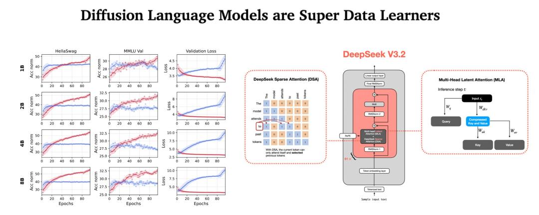 文章核心观点 - 行业认为Transformer架构在未来至少一至几年内仍将是AI生态系统的基石,但竞争焦点正从单纯追求模型规模转向效率优化和混合架构[4][5] - 扩散语言模型因其并行生成特性和在数据稀缺条件下的学习优势,成为2026年值得关注的新兴变量,但其在工具调用方面的缺陷限制了其作为智能体的应用[11][12][19] 效率战争:混合架构与线性注意力的崛起 - 行业近期重点转向混合架构与效率提升,例如DeepSeek V3采用混合专家模型和多头潜在注意力,在拥有6710亿参数的情况下,每次推理仅激活370亿参数,显著降低了推理成本[7] - 多家公司推出效率导向的模型变体,如Qwen3-Next、Kimi Linear、Nvidia Nemotron 3以及采用稀疏注意力的DeepSeek V3.2[7] - 标准Transformer注意力机制具有O(N²)的计算复杂度,导致长上下文处理成本剧增,因此行业正积极研发线性注意力或稀疏注意力等方案以降低计算开销[9] - 2026年的竞争核心在于如何在更长的上下文和更低的延迟下,提供同等的模型性能[10] - 部分模型采用混合策略,例如将高效的线性层与全注意力层以一定比例混合,以平衡长距离依赖捕捉能力和推理速度[14] 扩散语言模型:速度与代价的博弈 - 扩散语言模型采用并行生成方式,能够以相对快速且低廉的成本生成Token,其生成过程被类比为从噪声中并行“冲洗”出整段文字[12] - 行业预测Google可能在2026年推出Gemini Diffusion,作为其更便宜的Flash模型的替代品,并强调其生成速度“明显快于我们目前最快的模型”[12] - 扩散模型并行生成的特性导致其无法在响应链中原生地整合工具调用,这使其在作为智能体应用时面临巨大挑战[13][15] - 研究表明,若为了匹配自回归模型的性能而增加扩散模型的去噪步数,其最终计算成本可能与自回归模型相差无几[17] 数据枯竭时代的「超级学习者」 - 在互联网高质量文本数据接近枯竭的背景下,扩散语言模型可能成为更好的数据学习者[18][24] - 研究论文《Diffusion Language Models are Super Data Learners》指出,当进行多轮次训练时,文本扩散模型的表现可能优于标准的自回归大语言模型[19][25] - 在数据量受限的情况下,扩散语言模型通过增加训练轮数,其表现持续超越自回归模型,例如一个10亿参数的扩散语言模型,仅通过反复训练10亿个Token,就在HellaSwag和MMLU基准测试上分别达到了超过56%和超过33%的准确率[26][27] - 对于扩散语言模型,验证集损失的上升并不一定意味着下游任务能力的下降,即使看似“过拟合”,其在代码生成、推理等任务上的表现可能仍在提升[28] - 扩散模型具备任意顺序建模、超高密度计算以及内置的蒙特卡洛增强等特性,使其能从有限数据中进行更高效的学习[31]
