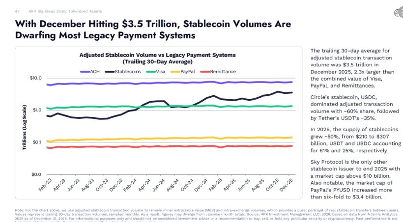 文章核心观点 - 稳定币的原始链上交易量数据(如年交易量35万亿美元)被严重高估,其中大部分并非真实的终端用户支付,而是由交易所资金平衡、交易套利、智能合约交互等技术性操作构成 [1][2][4][7][14] - 经麦肯锡与Artemis Analytics精细化分析,2025年稳定币实际用于支付的规模约为3900亿美元,仅占全球支付总量的0.02%,但较2024年实现了翻倍增长,表明其在支付领域真实存在并处于快速增长早期 [3][8][16] - 稳定币在支付领域展现出清晰的价值主张和巨大潜力,尤其在B2B支付、跨境汇款等场景优势明显,但其规模化应用尚不均衡,高度集中于亚洲地区,未来发展取决于场景复制、技术研发与监管完善 [9][12][17][18][19] 稳定币交易量的误读与真实规模 - 稳定币年交易量高达35万亿美元,调整后的30天移动平均值达3.5万亿美元,是Visa、PayPal和汇款业务总和的2.3倍,但这些数据包含了大量非支付活动 [4] - 非支付活动主要包括:加密货币交易所与托管机构的内部资金划转、交易与套利活动、智能合约自动交互、以及协议层技术操作导致的多笔交易 [2][14] - 剔除上述干扰因素后,2025年稳定币实际支付规模约为3900亿美元,仅占全球支付总量的0.02% [3][8][16] - 公开的原始交易数据不能等同于支付普及程度或可产生的实际营收规模,金融机构需进行精细化解读 [15] 稳定币支付的市场现状与结构 - **整体规模与增长**:2025年稳定币实际支付规模约3900亿美元,较2024年翻倍 [3][16] - **按类别划分**: - 企业间(B2B)支付:年化规模约2260亿美元,占稳定币支付总额的60%,同比增长733% [17][18] - 消费者间(C2C)支付:年化规模约770亿美元,占0.37%,同比增长42% [17] - 消费者对企业(C2B)支付:年化规模约760亿美元,占0.11% [17] - 企业对消费者(B2C)支付:年化规模约110亿美元,占0.01%,同比增长86% [17] - **按地域划分**:支付活动高度集中,亚洲地区交易额约2450亿美元,占总量的60%,主要由新加坡、香港、日本驱动;北美约950亿美元;欧洲约500亿美元;拉丁美洲和非洲均不足10亿美元 [12][18] 稳定币在具体支付场景的渗透率 - **全球薪资与跨境汇款**:稳定币在该领域的年化支付规模约900亿美元,而该领域整体交易规模达1.2万亿美元,稳定币渗透率不足1% [9] - **企业间(B2B)支付**:稳定币年化规模约2260亿美元,全球B2B支付整体规模约1.6万亿美元,稳定币渗透率仅约0.01% [9] - **资本市场结算**:稳定币年化结算规模约80亿美元,全球资本市场整体结算规模达200万亿美元,稳定币占比不足0.01% [10] - **卡关联消费**:与稳定币挂钩的银行卡消费额增长迅速,预计到2026年将增至45亿美元,较2024年增长673% [17] 稳定币的增长潜力与未来展望 - **市场预期强劲**:稳定币流通供应量已从2020年的不足300亿美元突破至3000亿美元,美国财政部长及头部金融机构预测到2030年供应量可能达到2万亿至4万亿美元 [8] - **价值主张清晰**:相比传统支付渠道,稳定币在结算速度、流动性管理和用户体验摩擦方面具有明显优势 [17] - **处于早期阶段**:稳定币支付是真实存在且正在增长的,但当前渗透率极低,表明其处于规模化发展的早期阶段,机会巨大 [3][19] - **发展路径**:规模化应用依赖于更清晰的数据分析、理性的投资布局,以及从交易数据中辨别有效信号的能力,其潜力释放有赖于技术、监管与市场落地的协同推进 [19]