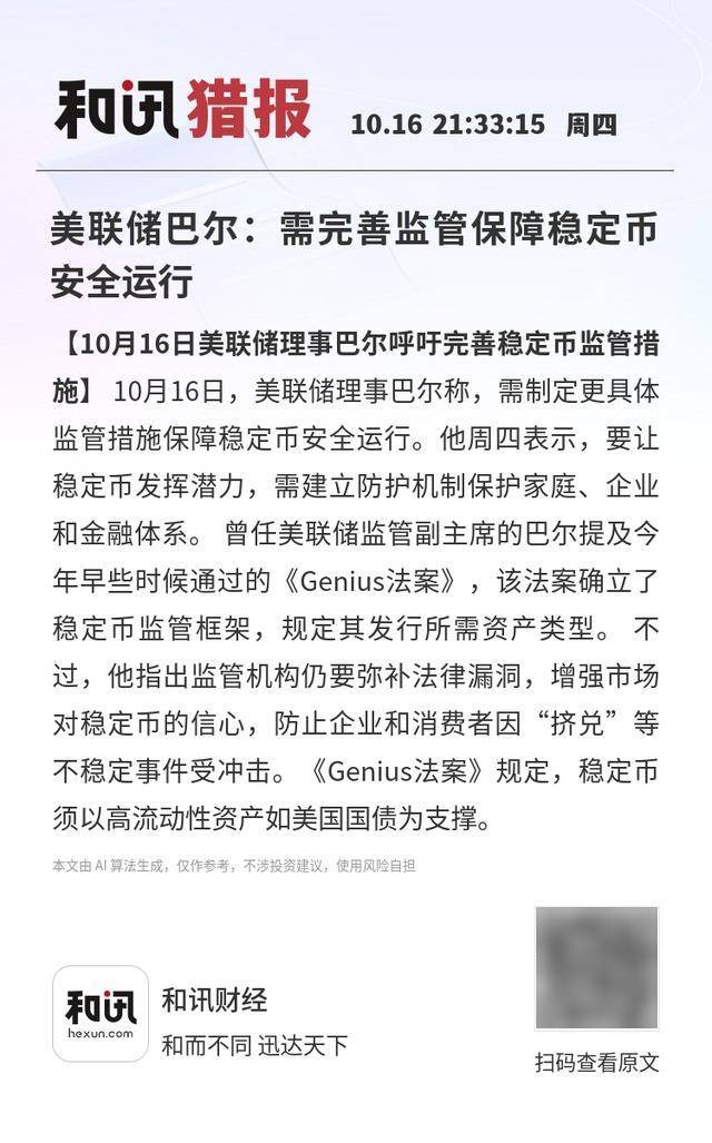 监管政策动向 - 美联储理事巴尔呼吁制定更具体的稳定币监管措施以保障其安全运行 [1][2] - 监管机构需弥补现有法律漏洞以增强市场对稳定币的信心 [1][2] - 监管目标是建立防护机制以保护家庭、企业和金融体系 [1][2]   现有监管框架 - 《Genius法案》已于今年早些时候通过并确立了稳定币的监管框架 [1][2] - 该法案规定了稳定币发行所需的资产类型 [1][2] - 法案要求稳定币须以高流动性资产如美国国债作为支撑 [1][2]   监管核心目的 - 完善监管旨在让稳定币发挥其潜在作用 [1][2] - 防止因“挤兑”等不稳定事件对企业及消费者造成冲击 [1][2]