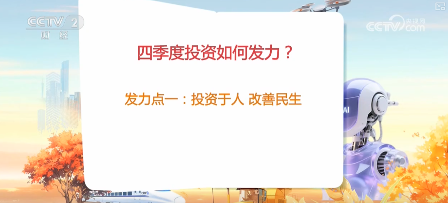 央视网消息:投资是拉动经济增长的"三驾马车"之一。四季度,国内投资发力的重点在哪里,专家进行了权威解读。 发力点一:投资于人 改善民生 国家信息中心经济预测部产业经济研究室主任魏琪嘉介绍,四季度整个投资的重点领域,很多集中于民生项目建设方面,包括城市 更新改造,地下管廊改造,包括停车场建设以及高标准农田等,这些事关民生的一些重点的领域,实现这种投资于物与投资于人的 这种高效协同,更多的投资于人。 为促进金融更好服务实体经济,推动扩大有效投资,国家发展改革委在9月底对外发布,推出新型政策性金融工具规模共5000亿 元,全部用于补充项目资本金。专家表示,这能够有效缓解地方政府投资的资金压力,有望撬动约3万亿元投资。 发力点三:5000亿元撬动投资增量 魏琪嘉表示,包括新型金融工具对投资领域的作用,体现为一个引导和提振预期的作用,也会向经营主体释放出稳投资以及未来发 展持续改善向好的信号。 发力点二:投资于创新 加快形成新质生产力 魏琪嘉表示,科技领域的创新投资,起到的作用不仅仅是在当下的积累,其实也对中长期形成自身发展优势,加快形成新质生产力 也起到了重要的作用。 ...