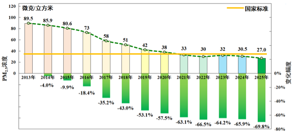 本文转自【北京晚报微信公众号】; 1月4日,北京市人民政府新闻办公室举行北京市空气质量状况新闻发布会。 北京市生态环境局介绍,2025年北京的空气质量再创佳绩,PM2.5年均浓度达到27.0微克/立方米,首次"破30";空气质量优良天比率首次超八成;重污染 日基本消除。 2013-2025年北京市PM2.5浓度及累计变幅 北京市PM2.5实现稳定达标。北京市开展大气污染防治以来,PM2.5保持长期改善趋势,从2013年的89.5微克/立方米,降至2025年的27.0微克/立方米,降 幅达69.8%。其中,"十四五"时期,北京市PM2.5年均浓度连续五年达到国家标准并屡创新低,在2021年首次达到国家标准后,2025年较2020年再降三 成。经过多年努力,北京市PM2.5已经实现稳定达标。 主要污染物大幅改善。与2013年相比,2025年北京市主要污染物PM2.5、PM10、NO2、SO2年均浓度分别下降69.8%、55.6%、60.7%、84.9%,空气质量 显著改善。重污染日由2013年的58天,大幅减少至2025年的1天,降幅高达98.3%,重污染日基本消除。 2013-2025年北京市主要污染物浓度及降 ...