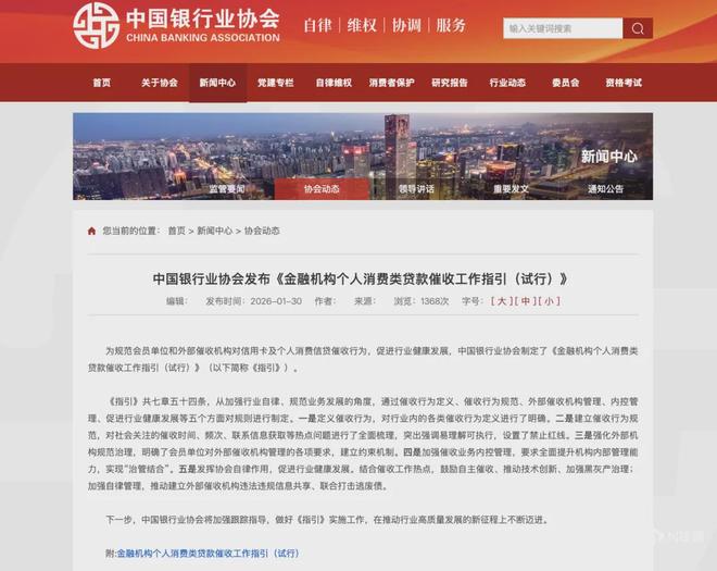 行业监管新规发布 - 中国银行业协会于1月30日正式发布《金融机构个人消费类贷款催收工作指引(试行)》,旨在规范信用卡及个人消费贷款催收行为,促进行业健康发展 [1] - 新规涵盖七章五十四条,从五个维度为催收行业划定“硬规定” [1] 行业现状与痛点 - 近年来,违规催收引发的纠纷屡见不鲜,大量消费者在社交平台吐槽遭遇暴力催收 [3] - 具体乱象包括高频骚扰电话(如深夜11点仍有陌生号码打入)、泄露隐私、向无关联系人(如朋友、同事)发送威胁信息等 [3][9][10] - 这些行为严重侵犯消费者权益,相关话题多次登上社交平台热搜,引发对行业规范的强烈呼吁 [10] 新规核心内容:行为规范与禁止红线 - **明确催收时间与频次**:未经债务人同意,严禁在每日22:00至次日8:00进行电话、外访等任何形式催收;债务人电话未接通时,对同一联系方式单日拨打不得超过6次 [12] - **划定八大禁止行为“红线”**:包括禁止冒用行政机关等名义催收;禁止通过散布隐私、恐吓、辱骂、暴力等手段催收;禁止虚构或夸大事实(如虚构黑名单);禁止以催收名义收取额外费用或诱导债务人新增借贷还款;禁止在公共场所张贴催收公告;外部机构未经同意不得使用私人手机或社交软件联系债务人;禁止未经同意进入私人场所;禁止采取其他违法违规手段 [13][14][15][16][17] - **精细化管理“第三人”联系**:原则上严禁对债务无关第三人进行催收,仅在债务人失联等特定情形下,为获取联系方式可联系无关第三人,但严禁透露债务信息,若对方拒绝则须停止联系 [22] 新规核心内容:机构管理与自律 - **强化会员单位(银行等金融机构)主体责任**:要求对合作的外部催收机构实行“白名单制”管理,并在官网等渠道进行公示 [18] - **落实穿透式监管**:要求会员单位将互联网平台催收业务全面纳入管理,对外部催收机构建立约束机制 [18] - **加强内控与全流程管理**:要求会员单位建立健全催收业务管理制度,设置专门岗位,加强培训、检查与考核,建立“事前预防、事中控制、事后解决”的全流程管理体系 [19] - **发挥协会自律作用**:推动建立外部催收机构违法违规信息共享机制,联合打击逃废债行为,同时鼓励会员单位自主催收、推动技术创新 [19] 新规的意义与影响 - 将原则性要求转化为可执行、可核查的量化规则,为债务人与从业机构提供了明确的行为预期,直击“深夜电话轰炸”与“呼死你”式骚扰痛点 [21] - 强力压实银行的主体责任,旨在通过穿透式监管实现“良币驱逐劣币”,使内部管理规范、合规记录良好的第三方机构胜出 [22][23] - 体现了监管思维从事后惩戒向源头治理的深刻转变,推动建立全流程风险管理体系 [23] - 对人工智能等新技术在催收中的应用进行了规范,鼓励金融机构自建催收团队、运用智能化工具,以提升合规可控性 [23] - 规范催收行为的同时,也旨在打击逃废债、“反催收联盟”等金融黑灰产 [23]