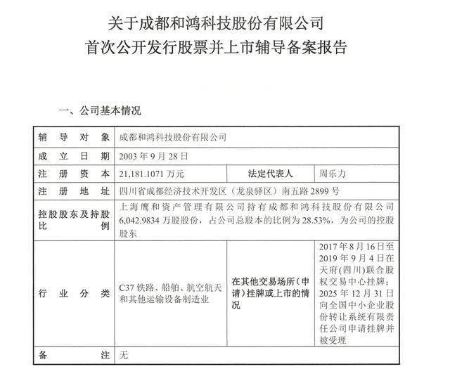 公司基本情况 - 公司全称为成都和鸿科技股份有限公司,成立于2003年9月28日,法定代表人为周乐力,注册地址位于四川省成都经济技术开发区 [1] - 公司注册资本为2.11811071亿元 [1] - 公司控股股东为上海鹰和资产管理有限公司,持有6,042.9834万股股份,占总股本的28.53% [1] - 公司实际控制人为周乐力,其通过直接和间接方式合计控制公司42.03%的股份,并通过上海鹰和、上海先鹰间接控制公司47.33%的股权,能够对公司决策和经营产生重大影响 [4] - 实际控制人周乐力的一致行动人周乐利、周乐致为其兄弟,分别担任公司董事和副总经理,并通过成都科创鹰间接持有公司股份 [5] 业务与行业 - 公司是国家级专精特新“小巨人”企业,主要从事航空发动机、燃气轮机的涡轮叶片等核心零部件的工艺研发、精密加工及特种工艺处理业务 [2] - 公司所属行业为铁路、船舶、航空航天和其他运输设备制造业 [1] 财务表现 - 2023年、2024年及2025年上半年,公司营业收入分别为3.76亿元、3.25亿元、1.75亿元 [2] - 同期,公司净利润分别为8,166.55万元、1,610.18万元、2,547.14万元 [2] - 同期,公司毛利率分别为43.86%、25.60%、36.99% [2] - 2025年上半年,公司归属于申请挂牌公司股东的净利润为2,557.31万元,扣除非经常性损益后的净利润为2,222.22万元 [4] - 2023年至2025年上半年,公司加权净资产收益率分别为13.43%、2.46%、3.76% [4] 资本运作进程 - 公司于2025年12月31日向全国中小企业股份转让系统有限责任公司申请新三板挂牌并被受理 [1][7] - 2025年1月16日,公司收到新三板审核问询函 [7] - 2025年2月13日,公司在四川证监局完成IPO辅导备案,拟在A股上市,辅导机构为长江证券承销保荐有限公司 [1] 关联方与监管关注 - 公司董事长周乐力于2025年11月出任新三板挂牌公司沈阳中科三耐新材料股份有限公司的董事长、总经理及法定代表人 [7] - 中科三耐主要产品包括工业燃气轮机热端涡轮叶片、航空航天用特种精密铸件等,与公司业务存在相似性 [8] - 公司董事周乐利的配偶贺功碧持有中科三耐22.36%股权,为该公司第二大股东,并向其提名两名董事 [8] - 周乐力出任董事长后,中科三耐控股股东及实际控制人由中国科学院金属研究所变更为无控股股东、无实际控制人 [8] - 监管问询函关注中科三耐控制权变更的背景与依据、周乐力家族是否实际控制中科三耐、两家公司业务是否相同、客户供应商是否重叠、是否构成同业竞争,以及周乐力同时管理两家公司是否具备充足履职时间和精力、是否违反竞业禁止规定、是否损害公司利益等问题 [8]