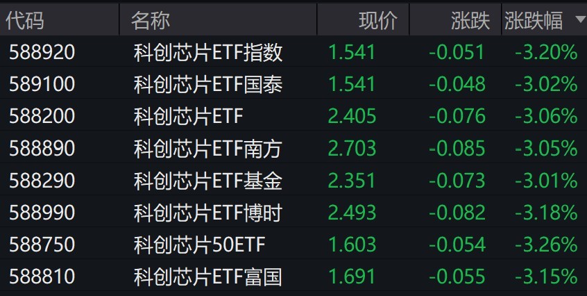 受盘面影响,科创芯片相关ETF跌超3%。 (文章来源:每日经济新闻) | 代码 | 名称 | 现价 | | 涨跌 涨跌幅 | | --- | --- | --- | --- | --- | | 588920 | 科创芯片ETF指数 | 1.541 | -0.051 | -3.20% | | 589100 | 科创芯片ETF国泰 | 1.541 | -0.048 | -3.02% | | 588200 | 科创芯片ETF | 2.405 | -0.076 | -3.06% | | 588890 | 科创芯片ETF南方 | 2.703 | -0.085 | -3.05% | | 588290 | 科创芯片ETF基金 | 2.351 | -0.073 | -3.01% | | 588990 | 科创芯片ETF博时 | 2.493 | -0.082 | -3.18% | | 588750 | 科创芯片50ETF | 1.603 | -0.054 | -3.26% | | 588810 | 科创芯片ETF富国 | 1.691 | -0.055 | -3.15% | 科创芯片概念股走弱,澜起科技跌超7%,中微公司、沪硅产 ...