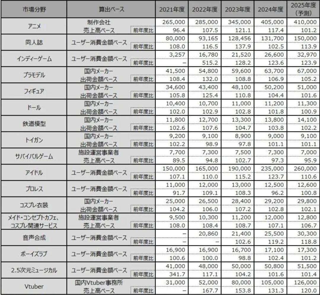 御宅经济整体市场规模与增长 - 日本御宅族经济涵盖17个核心消费领域,2024年总消费金额为12056亿日元(约531亿元人民币),预计2025财年将增长至12927.7亿日元(约570亿元人民币),增幅约为7.23% [1] - 在17个细分品类中,预计15个品类在2025年将保持市场规模增长,仅生存类游戏和职业摔角两类可能出现规模收缩 [2] - 独立游戏市场被寄予厚望,预计在2025年引领新一轮市场热潮 [2] 主要细分领域市场规模与表现 - **动画**:作为市场规模最大的品类,2024年相关消费金额达4050亿日元,同比增幅17.4%,但预计2025年增幅将大幅收窄至1.23% [3] - **偶像**:2024年消费金额达2350亿日元,同比增幅23.7%,预计2025年消费金额将扩大至2600亿日元 [4] - **同人志**:2024年消费金额为1317亿日元,同比增幅2.5%,预计2025年消费金额将达到1500亿日元 [5] - **VTuber**:2024年消费金额突破1050亿日元,同比增幅达31.3%,成为年度增长冠军;日本国内VTuber爱好者估计达96万人,年均消费金额高达71179日元 [6] - **独立游戏**:2024年消费金额为266亿日元,预计2025年将增至329.7亿日元,同比增长率可达23.9% [3][8] - **音声合成**:虽消费规模不及头部品类,但已连续两年保持近20%的高增长 [8] - **生存游戏与职业摔角**:是预计出现市场萎缩的两个领域;其中生存游戏设施运营商销售额2024年同比下降2.7%至73亿日元,预计2025年将进一步收缩至70亿日元 [3][8] 独立游戏市场增长驱动因素 - 恐怖解谜游戏《8号出口》在发售后销量突破200万份,催生出大量采用其玩法框架的“类8号出口”游戏,形成了公认的游戏类别 [9][11] - 《8号出口》被改编为真人电影和小说,其中真人电影在72天内实现票房收入50.7亿日元,显著提升了独立游戏在大众层面的认知度和商业价值 [11] - 类魂游戏在独立游戏领域数量持续增长,亚太地区贡献了约80%的类魂游戏作品及97%的总销量;中国玩家数量占比约47%,日本市场也值得注意 [13] - 独立游戏开发难度低于大型游戏,但售价更低,优秀的独立游戏在圈层内传播能力强,是其有望推动御宅经济增长的关键因素之一 [13]