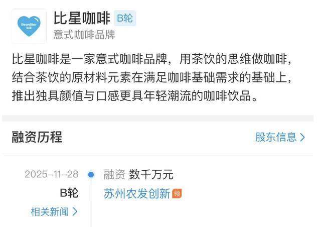 瑞财经 吴文婷11月28日,据媒体报道,连锁精品加盟咖啡品牌"比星咖啡"于近期完成数千万元B轮融 资。 本轮融资由苏州市农发产业科创基金独家领投。该基金是苏州市委、市政府为加强农业科技创新,发展 新质消费生产力而组建的科创投资基金。本轮融资将主要用于拓展线下门店、品牌推广。 公开资料显示,自创立品牌起,创始人吴彬彬就明确要走"精品咖啡小店加盟"之路,他曾拥有丰富的连 锁茶饮加盟品牌创业背景。 在其看来,虽然外卖大战等价格战短期会让消费者被低价吸引,但最终留住用户的仍然是好产品。由于 主流消费人群是25-35岁的女性用户,为了满足她们的口味,比星咖啡也一直在特调和咖啡风味上下功 夫。 比星咖啡称,现阶段品牌的商业模式已经跑通,明年的目标是加速扩张,要开到1000家店。按照行业成 功品牌的经验,瑞幸、库迪和幸运咖都曾凭借加盟模式迅速铺开规模。 ...