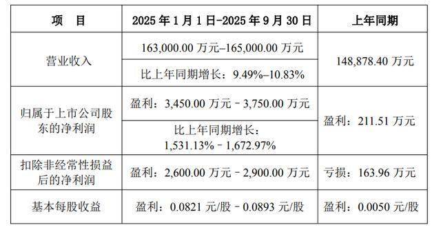 2025年前三季度,英联股份公司营业收入预计为16.3亿元-16.5亿元,上年同期为14.89亿元,比上年同 期增长9.49%-10.83%;归属于上市公司股东的净利润预计盈利0.35亿元-0.38亿元,上年同期盈利0.02亿 元,比上年同期增长1531.13%-1672.97%;扣除非经常性损益后的净利润预计盈利0.26亿元-0.29亿元, 上年同期亏损0.02亿元;基本每股收益预计盈利0.08元/股-0.09元/股,上年同期盈利0.01元/股。 | 项目 | 2025年7月1日-2025年9月30日 | 上年同期 | | --- | --- | --- | | 营业收入 | 54,915.31 万元 - 56,915.31 万元 | 51.476.12 万元 | | | 比上年同期增长:6.68% - 10.57% | | | 归属于上市公司 股东的净利润 | 盈利:932.22 万元 - 1,232.22 万元 | 亏损:287.88 万元 | | --- | --- | --- | | 扣除非经常性损 益后的净利润 | 盈利:638.37 万元 - 938.37 万元 | 亏损:400.90 万元 | ...