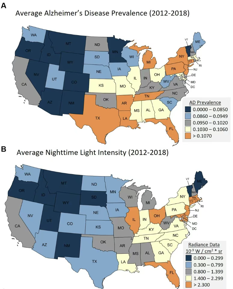光污染与阿尔兹海默症风险显著相关 这项研究的科研人员把美国48个州的光污染情况和本地区的医疗记录进行了比对,令人惊讶的是,他们竟然 发现光污染和阿尔兹海默症之间存在显著正相关,这种巧合也引起了科研人员的兴趣。 或许,居住在城市的你,总是享受早上被阳光唤醒的清晨,但是夜间不得不和窗外照进来的灯光相伴;又或 许,总是起夜的你,习惯留一盏夜灯,为你提供方便。 但是2024年9月发表于《神经科学前沿》的一项研究表明,这些在你睡眠时与你相伴的光线不仅会影响你休 息,还可能会增加阿尔兹海默症的风险。不过需要注意的是,这篇研究目前只是个前沿性的研究,所以只是 提出了这种可能性,还不能得出确切的结论,但是为进一步了解阿尔兹海默症、降低阿尔兹海默症风险提供 了新思路。 △美国各大州光污染程度和阿尔兹海默症患病情况 他们继而对被影响到的群体进行了更细致的划分,对于65岁以上的人,阿尔兹海默症的风险因素包括酗酒、 慢性肾病、抑郁症、糖尿病和高血压,光污染程度只是其中的风险因素之一。 而对于65岁以下的人群,在研究评估的众多因素中,光污染程度可能是影响阿尔兹海默症患病风险的第一大 因素。不过需要注意的是,这只能证明光污染和阿尔兹海默 ...