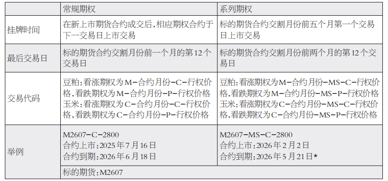来源:期爷浪期权 家人们,大商所官方公告,豆粕和玉米系列期权将于2026年2月2日(即1月30日夜盘)起挂牌交易,首批合约从2607合约开始。 那么什么是豆粕系列期权和玉米系列期权呢? 通常情况下,一个期货合约对应一个期权合约,这个期权合约就叫"常规期权"。因为豆粕和玉米的期货合约未覆盖12个月,所以期权也未覆盖12个月。为 了期权合约覆盖12个月,交易所将一个期货合约多加一个期权合约,也就是"系列期权"。 那就先要区分一下豆粕和玉米的"常规期权"和"系列期权"。 | | | | | | 系列期权合约——大商所豆粕期权 | | | | | | | | | | Seller 2 | | | | | | --- | --- | --- | --- | --- | --- | --- | --- | --- | --- | --- | --- | --- | --- | --- | --- | --- | --- | --- | --- | | 大连商品交易所(权) | | | 主力/标的 | | 最新价 | | 涨跌 | | | IV | | HV20 | | 共识 | | 如价 | | 挂典型 | 最高价 | ...