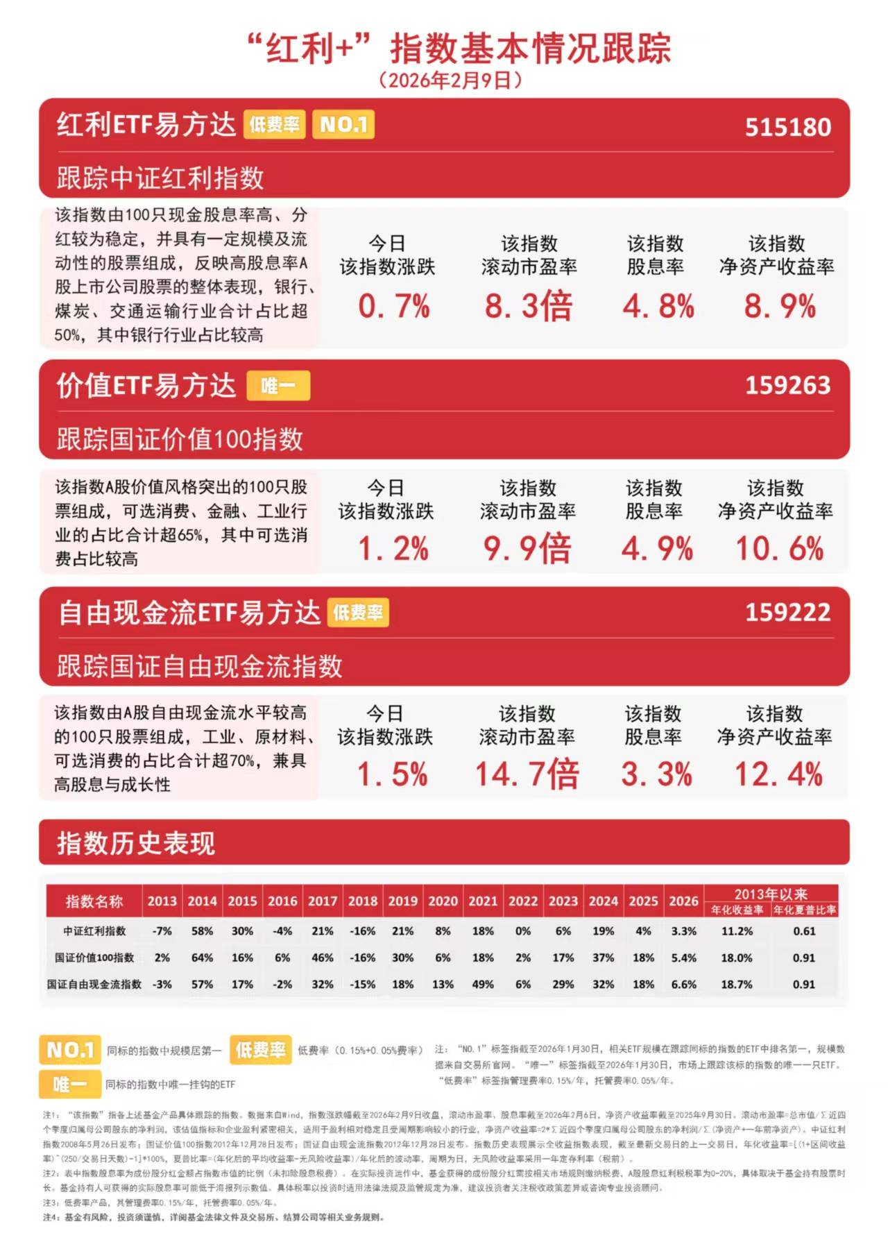 中证红利指数及相关ETF产品概况 - 红利ETF易方达跟踪中证红利指数 该指数由100只现金股息率高、分红较为稳定并具有一定规模及流动性的A股组成[1] - 指数成分股中 银行、煤炭、交通运输行业合计占比超过50% 其中银行行业占比较高[1] - 截至2026年2月9日 该指数日涨跌幅为0.7% 滚动市盈率为8.3倍 股息率为4.8%[1] - 从2013年至2026年 中证红利指数的年化收益率为11.2%[2] 国证价值100指数及相关ETF产品概况 - 价值ETF易方达跟踪国证价值100指数 该指数由A股价值风格突出的100只股票组成[1] - 指数成分股中 可选消费、金融、工业行业的占比合计超过65% 其中可选消费占比较高[1] - 截至2026年2月9日 该指数日涨跌幅为1.2% 滚动市盈率为9.9倍 股息率为4.9%[1] - 从2013年至2026年 国证价值100指数的年化收益率为18%[2] 国证自由现金流指数及相关ETF产品概况 - 自由现金流ETF易方达跟踪国证自由现金流指数 该指数由A股自由现金流水平较高的100只股票组成[1] - 指数成分股中 工业、原材料、可选消费的占比合计超过70% 产品兼具高股息与成长性[1] - 截至2026年2月9日 该指数日涨跌幅为1.5% 滚动市盈率为14.7倍 股息率为3.3%[1] - 从2013年至2026年 国证自由现金流指数的年化收益率为18.7%[2] 主要指数历史表现对比 - 中证红利指数在2014年、2015年、2019年、2020年、2022年、2023年及2026年表现较好 年收益率分别为58%、30%、21%、8%、18%、18%及19%[2] - 国证价值100指数在2014年、2015年、2017年、2020年、2023年及2026年表现突出 年收益率分别为64%、64%、30%、18%、37%及18%[2] - 国证自由现金流指数在2014年、2017年、2020年、2022年、2023年及2026年表现强劲 年收益率分别为57%、32%、49%、29%、32%及18%[2]