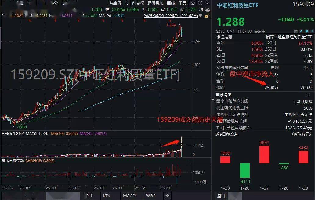 爆量成交创历史新高!“红利一哥”中证红利质量ETF逆市揽金近3000万,场外基金(026671)2月2日起售!