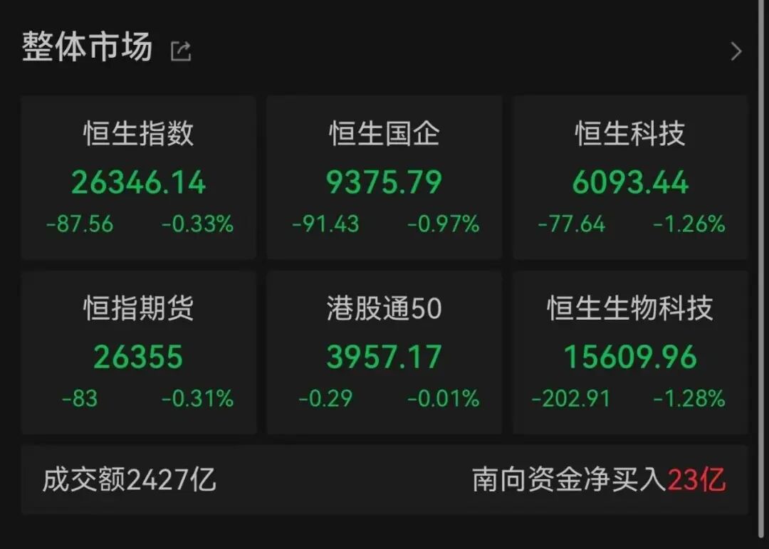 港股市场整体表现 - 港股三大指数高开低走,恒生指数下跌0.33%至26346.14点,恒生科技指数下跌1.26%,恒生国企指数下跌0.97% [1] - 市场盘面分化明显,大金融板块逆市走强,而科网股、芯片股、贵金属板块及医药股普遍下跌 [3]   科技与互联网板块 - 恒生科技指数成份股普遍下跌,中芯国际下跌3.26%,商汤、理想汽车、网易、比亚迪电子均跌超2% [3] - 腾讯、小米、美团、阿里巴巴等大型科网股均跌超1% [3] - 东吴证券观点认为科技板块弹性较高,但需观察美国科技股财报情况 [5]   大金融板块 - 大金融板块逆市走强,汇丰控股大涨4.41% [6][7] - 汇丰控股2025年第三季度列账基准除税前利润为73亿美元,同比减少12亿美元,但按固定汇率计算的除税前利润同比增长3%至91亿美元,收入同比增长5%至178亿美元 [6] - 公司调高今年净利息收益及平均有形股本回报率指引 [6] - 友邦保险上涨3.40%,中银香港、建设银行、恒生银行和招商银行等银行股均收涨 [6][7]   贵金属板块 - 避险情绪缓和压制贵金属板块,黄金股普遍下跌 [8] - 紫金矿业下跌5.59%,万国黄金集团下跌5.45%,潼关黄金下跌5.11% [8][11] - 国际金价进一步下探,COMEX黄金价格跌至3920美元/盎司下方 [8] - 珠宝首饰股周大福下跌4.55%,老铺黄金下跌3.96% [8][11]   医药板块 - 医药股延续弱势,映恩生物跌超5%,先声药业、晶泰控股、药明康德等跌幅在2%以上 [12][13] - 银河证券研报指出医药板块经历长期估值调整后出现结构性修复迹象,下半年创新药BD交易仍将活跃 [12]   新股上市表现 - 4只新股同日在港交所上市,滴普科技涨超150%,八马茶业涨超86%,剑桥科技涨超33%,三一重工涨超2% [15] - 滴普科技IPO募资规模为7.10亿港元,香港公开发售获7569.83倍认购 [15] - 八马茶业以发行价上限50港元定价,公开发售部分获超额认购2680.04倍 [15]   市场监管动态 - 香港证监会对12名涉嫌操纵环球智能控股股份的人士发出临时强制令,禁止其处置或以任何方式处理在香港的资产,以合共8240万港元为限 [17]