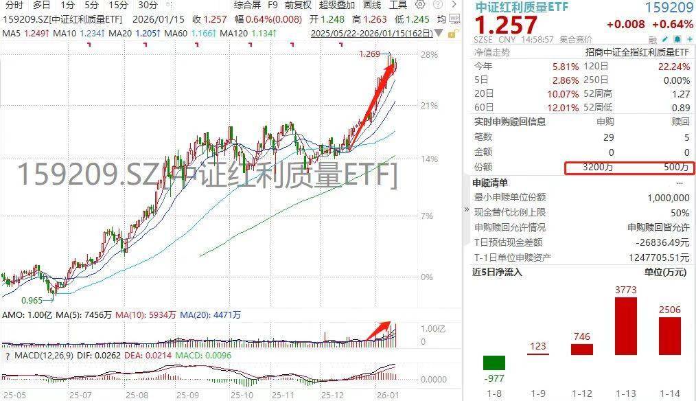 与此同时,深交所于1月9日发布公告,正式将中证红利质量ETF(159209)纳入最新一期融资融券标的名单,自2026年1月12日起施行。这一举 措将显著提升该产品的市场流动性和资金参与灵活性。作为一项结合"高股息"与"高盈利质量"的创新策略,该ETF及其联接基金的"双通道"完 善,为投资者提供了更便捷、多元的配置工具。 证监会及深交所近日为红利质量投资赛道带来双重利好。根据公开信息,招商中证全指红利质量ETF发起式联接基金已于2025年12月31日正式获 得证监会批准,这标志着目前两市唯一跟踪中证全指红利质量指数的场内工具——中证红利质量ETF(159209),正式打通场外投资渠道。 分析指出,监管与交易所的认可,反映了市场对"红利质量"这一升级版红利策略的接受度不断提高。其全市场最低档费率结构(管理费 0.15%+托管费0.05%)也增强了长期持有的成本优势。对于投资者而言,该产品的升级意味着可以更灵活地将"红利质量"策略纳入资产配置组 合,既可将其作为追求稳健现金流的基础配置,也可利用融资功能在明确看多时进行战术增强。风险提示:基金有风险,投资需谨慎。 1月15日,两市调整,高质量红利逆势走强。数据显示, ...