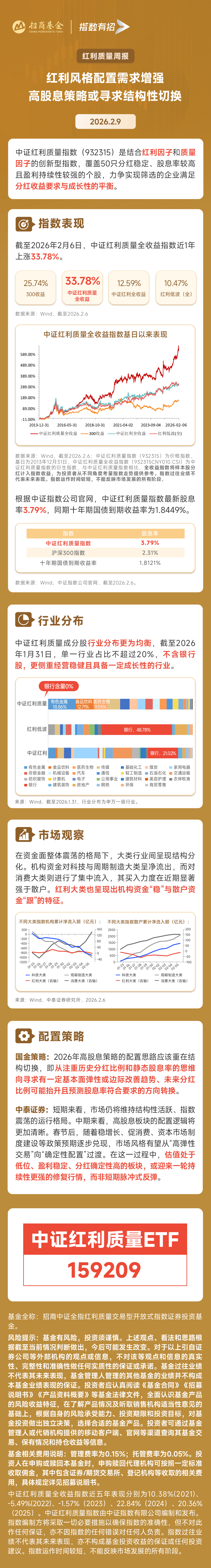 文章核心观点 - 在资金面整体震荡、市场结构性分化的格局下,高股息板块,特别是结合了红利与质量因子的策略,因其均衡的行业分布和稳健的基本面,获得了机构与散户资金的共同关注,中期配置逻辑清晰,有望迎来持续性修复行情 [1][13][14][16] 市场资金流向与产品表现 - 中证红利质量ETF(159209)在2月9日单日获资金净流入3572万元,今年以来累计净流入达4.65亿元,最新规模超12亿元,创上市以来新高 [1] - 市场资金呈现结构性分化,机构资金对消费大类进行集中流入,买入力度强于散户,而对科技与周期制造大类呈净流出 [13][14] - 红利大类呈现出机构资金“稳”与散户资金“跟”的特征 [1][14] 机构策略观点 - 中泰证券认为,短期市场将维持结构性活跃、指数震荡的运行格局,中期高股息板块配置逻辑将更加清晰 [1][16] - 春节后,随着稳增长、促消费、资本市场制度建设等政策预期兑现,市场风格有望从“高弹性交易”向“确定性配置”过渡 [16] - 估值处于低位、盈利稳定、分红确定性高的板块,或迎来一轮持续性更强的修复行情,而非短期脉冲式反弹 [1][16] - 国金策略提出,2026年高股息策略的配置思路应重在结构切换,从注重历史分红比例和静态股息率,转向寻求有基本面弹性或边际改善趋势、未来分红比例可能抬升且预测股息率符合要求的方向 [16] 中证红利质量指数特征 - 中证红利质量指数(932315)是结合红利因子和质量因子的创新型指数,覆盖50只分红稳定、股息率较高且盈利持续性较强的个股 [1] - 与传统红利指数过度集中于金融、能源等周期板块不同,该策略能够覆盖并优选消费、医药、高端制造等更具长期稳定性的新经济领域龙头,结构更均衡 [1] - 指数成分股行业分布均衡,截至2026年1月31日,单一行业占比不超过20%,且不含银行股,更侧重经营稳健且具备一定成长性的行业 [9][10] - 截至2026年2月6日,中证红利质量指数最新股息率为3.79%,显著高于同期沪深300指数的2.31%和十年期国债到期收益率(约1.81%-1.84%) [7] 指数历史表现 - 根据图表数据,中证红利质量全收益指数自基日(2013年12月31日)以来表现突出,截至2026年2月6日,累计收益显著超越沪深300收益、中证红利全收益及红利低波全收益指数 [3][5] - 具体表现为:中证红利质量全收益指数累计上涨5578%,同期沪深300收益指数上涨289.00%,中证红利全收益指数上涨389.00%,红利低波全收益指数上涨189.00% [3][5]