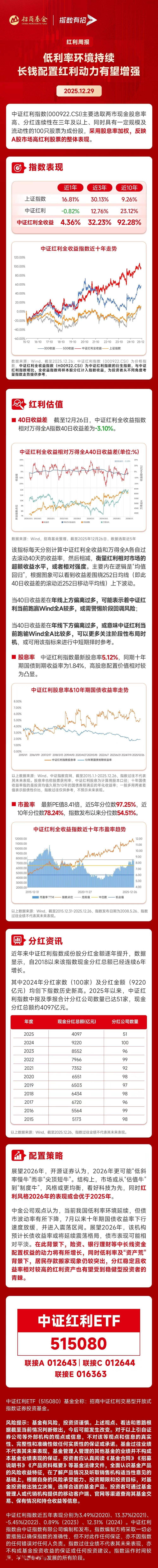 中证红利指数成份股分红情况 - 招商银行发布2025年半年度利润分配方案,拟向全体股东每股派发现金红利1.013元(含税),预计总派发金额为255.48亿元,现金分红比例为35.02% [1] - 中证红利指数成份股分红金额逐年提升,自2018年以来该指数现金分红总额已经连续6年增长 [1][19] - 2024年分红家数(100家)及分红金额(9220亿元)均创下指数历史新高 [1][19][20] - 2025年以来,中证红利指数中报及季报合计分红公司数量已达51家,现金分红总额约4097亿元 [1][19][20] 中证红利ETF分红情况 - 中证红利ETF(515080)于今年12月中下旬完成今年第四次分红,本次分红比例1.26%,每十份分红金额0.2元 [1] - 自上市以来,中证红利ETF(515080)已经连续15次分红,每十份累计分红金额为3.65元 [1] - 自2024年以来,中证红利ETF延续季度评估分红的节奏,每年分红4次,2024-2025年已经累计分红8次 [1] 指数历史表现 - 近1年、近3年、近10年,中证红利指数收益率分别为-0.82%、12.76%、23.12% [4] - 近1年、近3年、近10年,中证红利全收益指数收益率分别为4.36%、32.23%、92.28% [4] - 中证红利指数近五年年度表现分别为3.49%(2020)、13.37%(2021)、-5.45%(2022)、0.89%(2023)、12.31%(2024) [24] 股息率与估值水平 - 截至12月26日,中证红利指数股息率为5.12%,同期10年期国债到期收益率为1.84% [2][11] - 中证红利指数最新市盈率(PE)为8.41倍,其近5年分位数为97.25%,近10年分位数为78.24%,指数发布以来分位数为54.51% [14] 相对市场表现指标 - 截至12月26日,中证红利全收益指数相对万得全A指数的40日收益差为-3.10% [8] - 该40日收益差指标可用于衡量红利相对市场的超额收益水平,其逻辑基于“均值回归”,可作中短期择时参考 [10][11] 机构对2026年市场展望 - 开源证券认为,2026年更可能呈现“低斜率慢牛”而非“尖顶短牛”,市场风格或更均衡,看好科技板块,同时认为红利风格2026年的表现或会优于2025年 [2][22] - 中金公司观点认为,当前低利率环境延续,债市波动率下降,十年期国债收益率进入震荡区间,预计2026年长债收益率或将延续震荡格局 [2][22] - 在低利率及“资产荒”背景下,险资、银行理财等中长线资金配置权益的动力将增长,居民存款搬家现象突出,分红稳定且收益率较高的红利资产有望受到稳健型投资者青睐 [2][22]