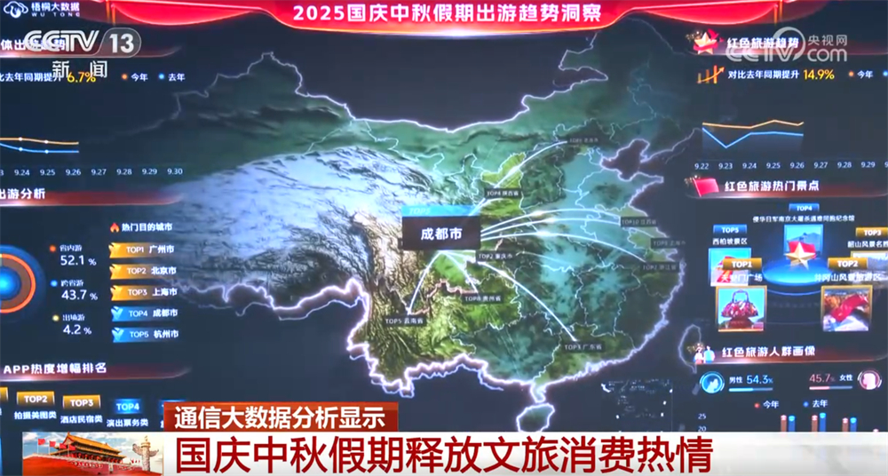 国庆中秋假期10月1日开启,移动通信大数据平台分析显示,中秋和国庆连休8天的假期将充分释放全国文旅消费热情。 今年的国庆中秋假期,不少上班族选择"请3休12"错峰出游,也就是说节前请3天假连休12天。中国移动梧桐大数据统计显示,9月27日— 30日出游人群规模相比前一周日均增长9%。 "请3休12"的休假模式使更多游客倾向于长线游,18%的游客选择前往500公里以上的目的地游玩,较去年同期提升5个百分点。 中国移动数智化部总经理助理永青拉姆称:"我们借助通信服务大数据分析发现,出游人群规模从9月27日开始上升,于10月1日达到高 峰,整体出游人群规模预计比去年同期日均增长3.5%。" 根据大数据平台的分析,热门长线游路线是上海至北京、深圳至长沙、北京至西安、上海至武汉、杭州至北京。出境游方面,除了港澳、 日韩、东南亚等传统热门目的地,中亚、欧洲、非洲部分国家受到拼假游客青睐,客流增长明显。大数据还发现,假期也被许多人用来安排人 生大事,节前婚庆类App的日均活跃用户规模较平日增长86%。 四川大英:乡村文艺"潮" 表达 节日氛围拉满 国庆中秋假期到来,在四川、重庆、江西等地,热门景区门票预订火热,游客关注度较 ...