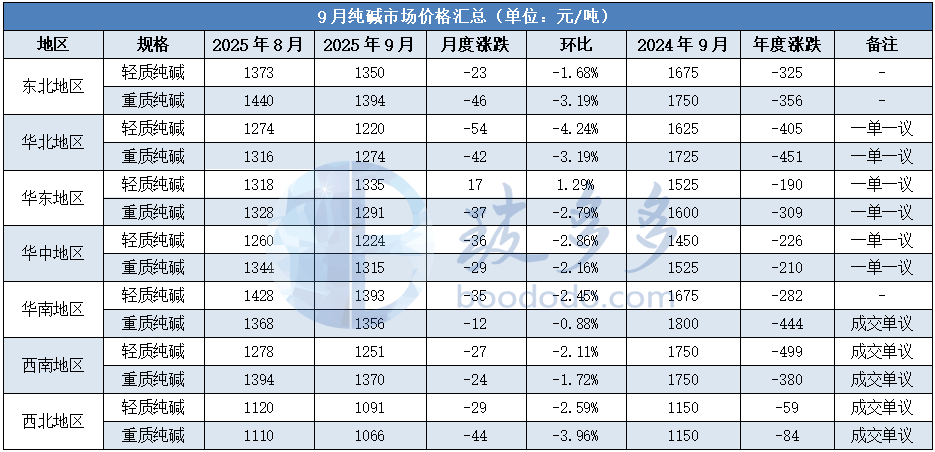1.2、本月纯碱市场价格对比 | | | | | 9月纯碱市场价格汇总(单位:元/吨) | | | | | | --- | --- | --- | --- | --- | --- | --- | --- | --- | | 地区 | 规格 | 2025年8月 | 2025年9月 | 月度涨跌 | 环比 | 2024年9月 | 年度涨跌 | 备注 | | 东北地区 | 轻质纯碱 | 1373 | 1350 | -23 | -1.68% | 1675 | -325 | - | | | 重质纯碱 | 1440 | 1394 | -46 | -3. 19% | 1750 | -356 | - | | 华北市区 | 轻质纯碱 | 1274 | 1220 | -54 | -4. 24% | 1625 | -405 | 一单一议 | | | 重辰纯碱 | 1316 | 1274 | -42 | -3. 19% | 1725 | -451 | 一单一议 | | 华东地区 | 轻质纯碱 | 1318 | 1335 | 17 | 1. 29% | 1525 | -190 | 一审一议 | | | 車质纯碱 | 1328 | 12 ...