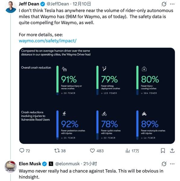 马斯克再开火,直言 Waymo 不可能赢过特斯拉