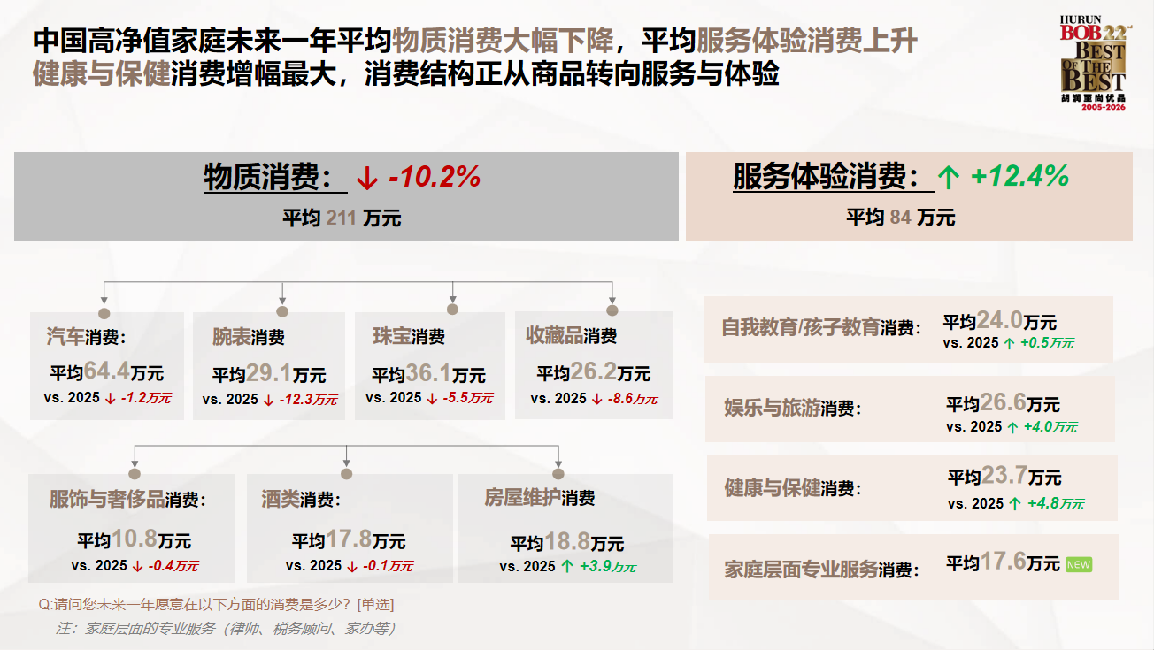1月30日,胡润研究院发布《2026胡润至尚优品——中国高净值人群品质生活报告》(下称"报告")。 这是胡润研究院连续第22年发布此报告,旨在揭示中国高净值人群的生活方式、消费习惯以及品牌认知的转变与偏好,力图对中国高净值人群的生活形 态变化做出描述。 值得关注的是,黄金已连续三年位列中国高净值人群投资偏好首位,期间,黄金价格从每克600多元上涨到了1100多元。 "上年,受访高净值人群对年底上证指数的预测与实际收盘点数只差4%。"胡润进一步指出,"今年,受访高净值人群预测年底上证指数将达到3820点, 有13%的人预测将超过4500点。" 消费结构迎来显著调整,受访人群计划未来一年物质消费减少10%,服务体验消费增加12%,对"难忘体验"与"身心修复"的追求,已超越单纯的物质享 受。 这一消费变化也直接反映在行业端。受消费心理变化、区域经济形势及全球动荡余波的影响,今年传统奢侈品行业依旧风云变幻。从财报数据来看, 2025年上半年,奢侈品集团普遍面临压力。 本次调研470位千万资产中国高净值人士,其中亿元资产以上超高净值人士70人。受访者平均家庭总资产6100万元,比过去五年平均水平高出38%,平 均可投资 ...