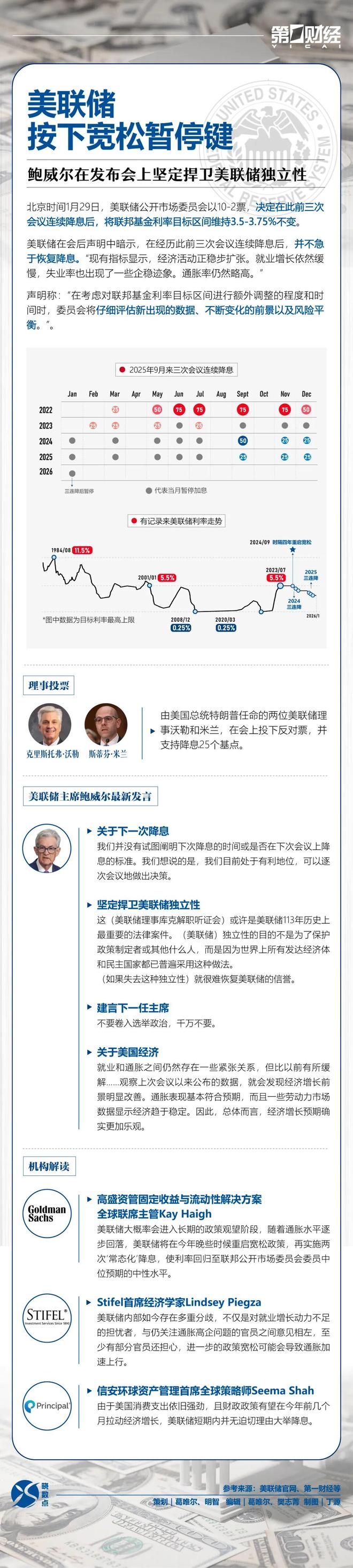 北京时间1月29日,美联储公开市场委员会以10-2票,决定在此前三次会议连续降息后,将联邦基金利 率目标区间维持3.5-3.75%不变。 美联储在会后声明中暗示,在经历此前三次会议连续降息后,并不急 于恢复降息。 一图速览>> 由美国总统特朗普任命的两位美联储理事沃勒和米兰,在会上投下反对票,并支持降息25个基 点。 鲍威尔坚定捍卫美联储独立性 , 关于下一次降息、美国经济、美国总统, 他还有哪些表态? 对于未来的货币政策,机构如何解读? 2023 25 26 25 25 2024 50 (25 25 2025 (25) (25) 25 2026 代表当月暂停加息 有记录来美联储利率走势 2024/09 时隔四年重启摄影 1984/08 111-V 2001/01 5 5 *图中数据为目标利率最高上限 2008/12 2020/03 0.259 0.25% 时事投票 我们并没有试图阐明下次降息的时间或是否在下次会议上降 息的标准。我们想说的是,我们目前处于有利地位,可以逐 次会议地做出决策。 ▶ 坚定捍卫美联储独立性 这(美联储理事库克解职听证会)或许是美联储113年历史上 最重要的法律案件。(美联储)独立性 ...