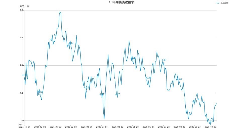 新华财经北京11月4日电投资者正在密切关注政府停摆情况,美债周二走势分化,短债下行,中长期美债上行,10年期美债收益率跌 2.2BP至4.085%。 目前美国政府停摆已达35天,即将超过上次最长停摆时间(2018年12月22日至2019年1月25日)。 周一,供应管理协会报告称,10月份ISM制造业指数为48.7%,低于预期。这一数据低于道琼斯49.3%的预期,较9月份下降了0.4个百分 点。 由于政府停摆而推迟了几份经济报告的发布,投资者对经济数据一无所知,其中包括本应在周五公布的美国10月就业报告。作为替代, 他们将关注ADP周三公布的民间就业报告,以寻找有关美国经济状况的线索。 美联储官员承认,缺乏关键经济报告带来了不确定性。美联储官员就经济现状及其面临的风险而展开的辩论势将在下一次政策会议之前 愈演愈烈。 美联储理事库克周一表示,就业和通胀任务面临的风险均上升,这意味着12月9日至10日的会议 "有可能"降息。这是特朗普总统试图解 雇库克后,库克首次发表政策演讲。 不到一周前,美联储主席鲍威尔表示,12月降息"并非板上钉钉",这一言论令市场感到恐慌。 美联储理事米兰则表示,在评估货币政策时过分强调股票 ...